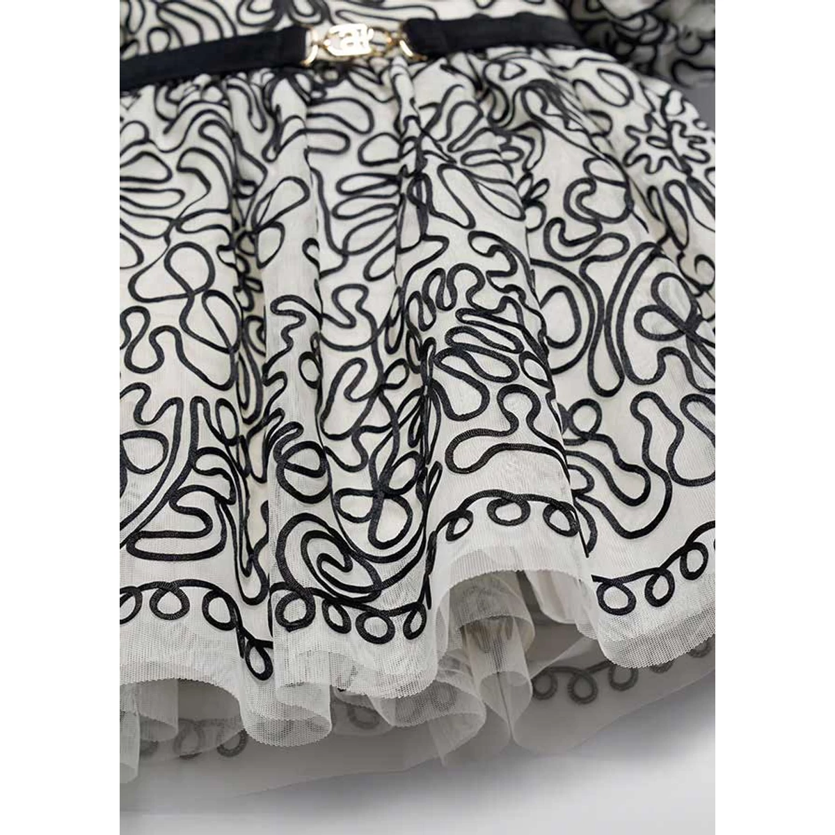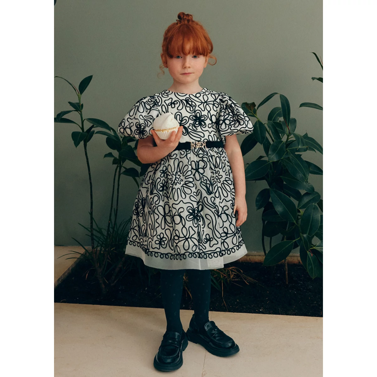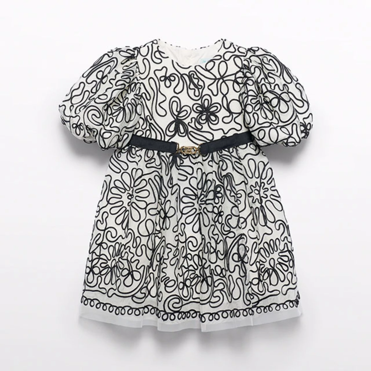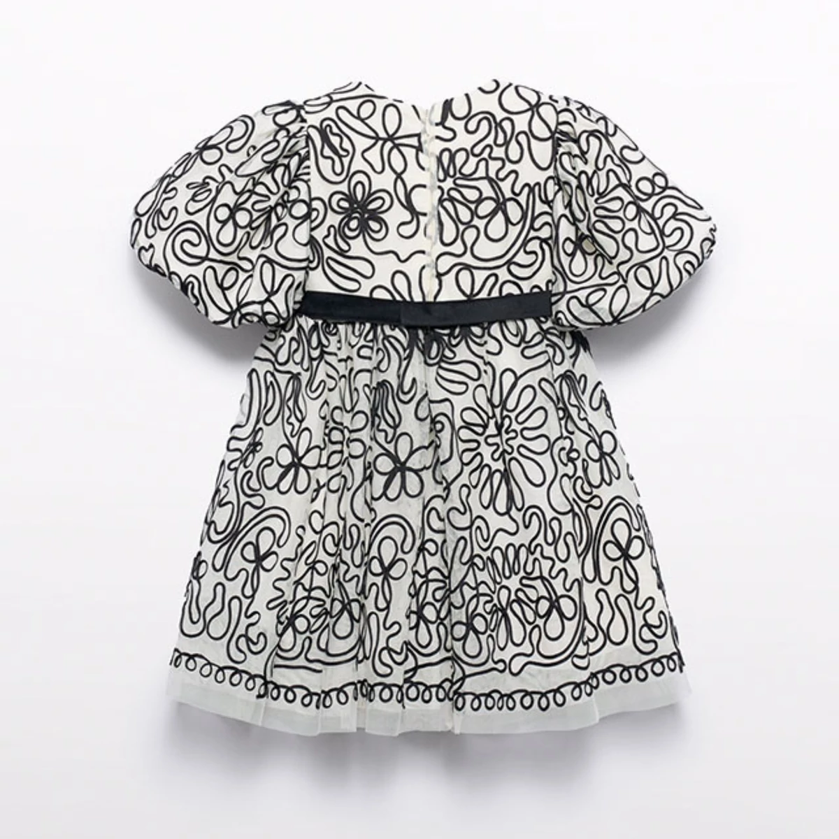 Abel&lula meseszép egyedi alkalmi tüllruha fekete-fehér hímzett virágmintás, derekát levehető fekete vékony öv díszíti arany csattal, egyedi puffos gumírozott ujjakkal, derékban szabott fazonú, hátán cipzárral záródik, 3 rétegű vékony tüll és egy pamut alsóruha található alatta . Hihetetlenül szép és egyedi ruha a legszebb alkalmakra. 2025 TÉL