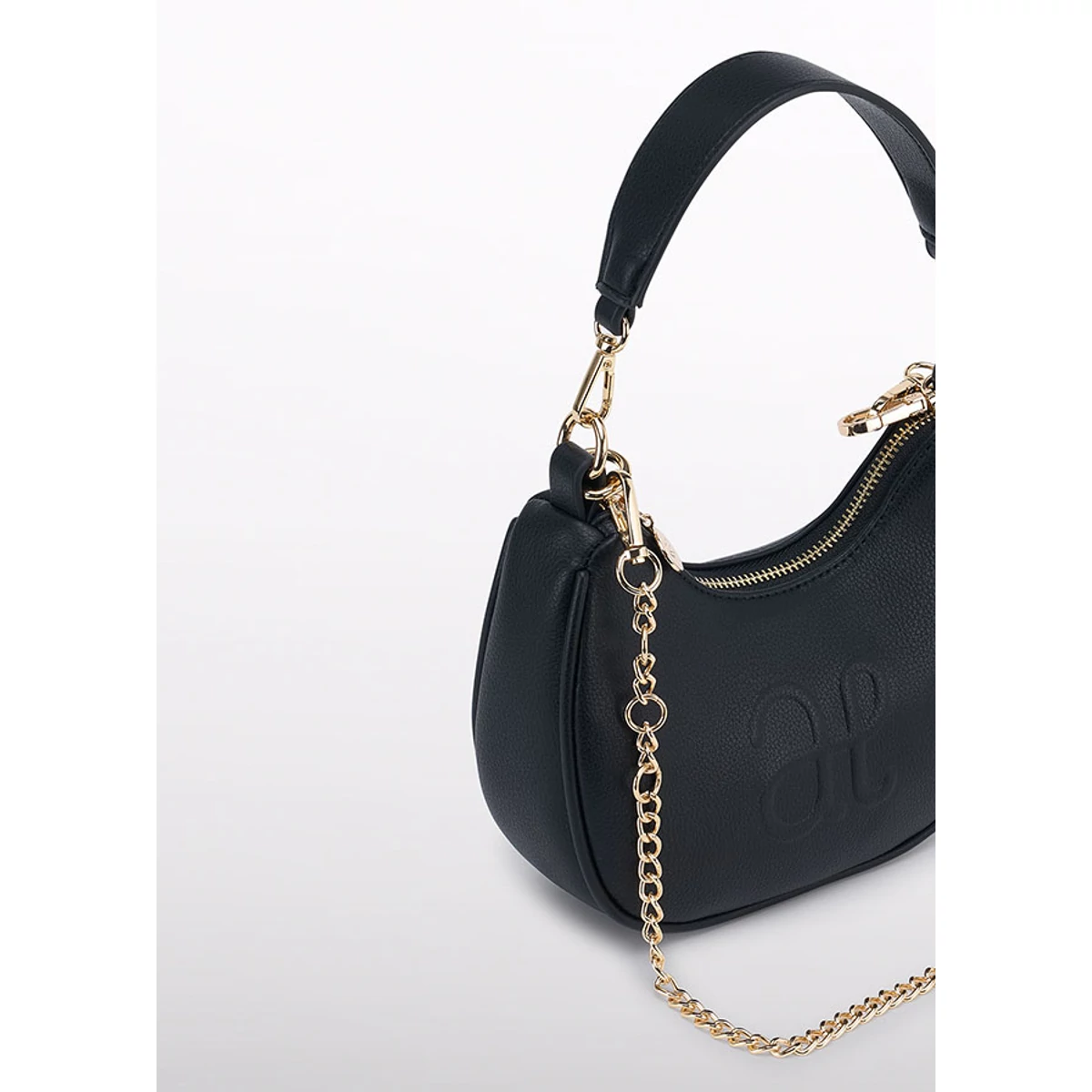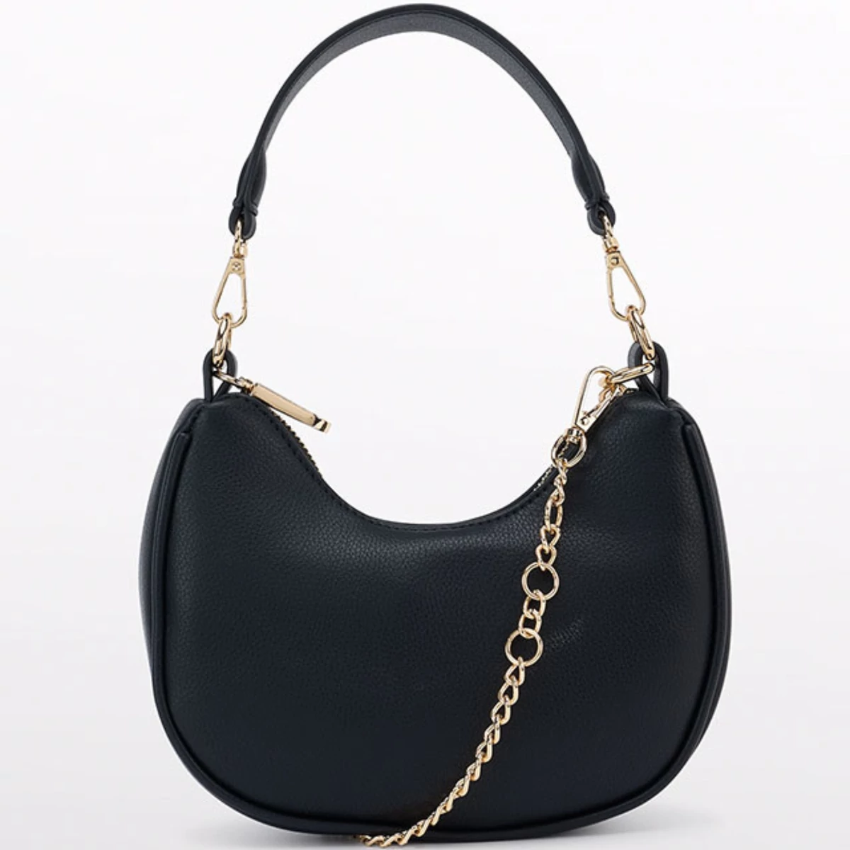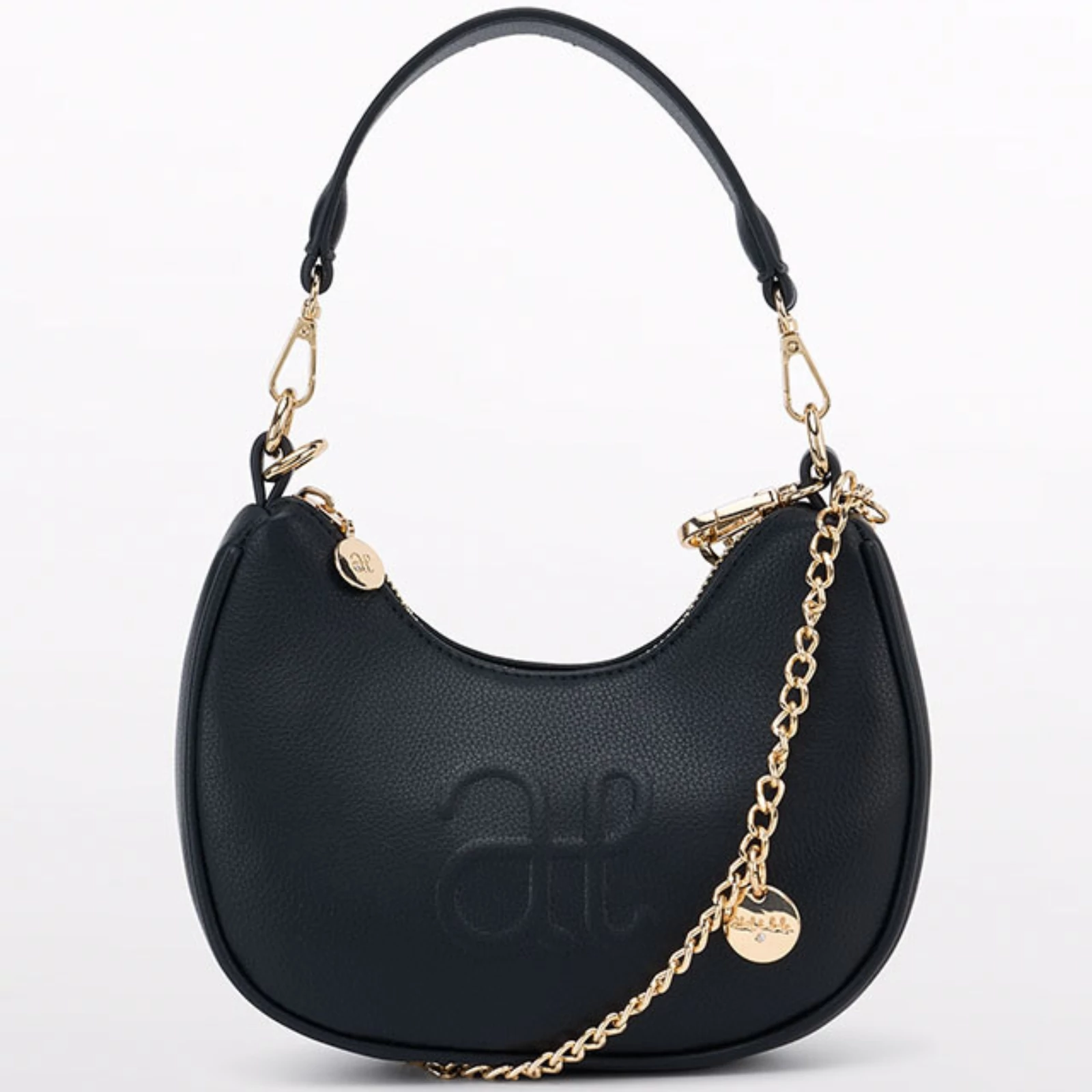 Abel&lula csodaszép fekete műbőr kézitáska ovális formájú, levehető arany lánc vállpánttal, cipzárral záródik, belül béléssel, pici kártyatartóval, Abel logóval díszített. Méretei: 20,5 cmx 15cm x 6cm 2025 TÉL