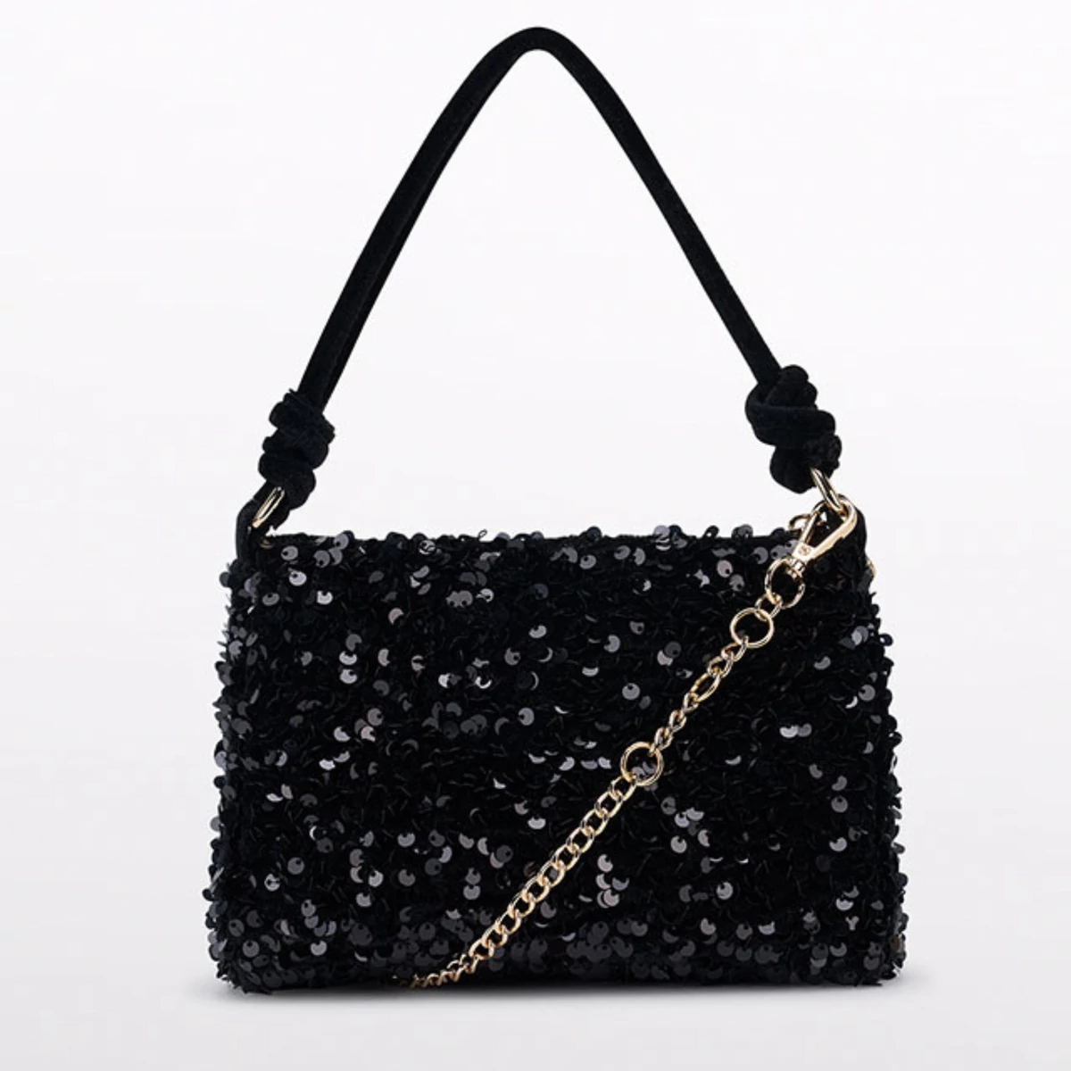 Abel&lula flitteres alkalmi táska bársony kézi pánttal, levehető arany láncos pánt tartozik hozzá, rugalmas anyagú csinos táska alkalmakra. Méretei: 22cm x 15 cm x 7cm 2025 TÉL