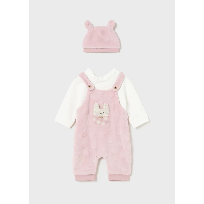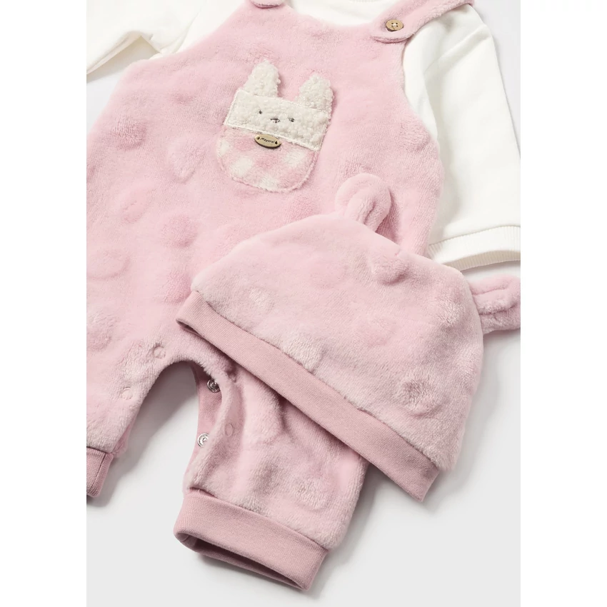 Mayoral cuki 2 részes plüss sapka és rugdalózó szett, ami egy lábfej nélküli meleg pihe-puha rugdalózóból áll, ami felső és kantáros nadrág hatású, de nem különálló termék, illetve egy bélelt fülecskés plüss sapkából áll. | |