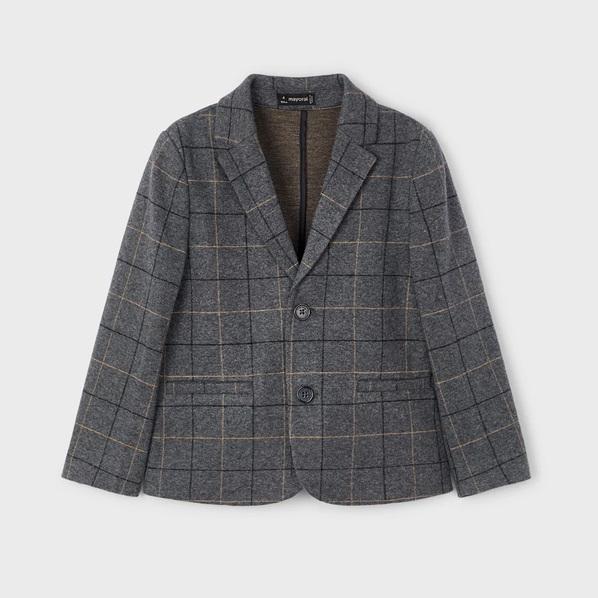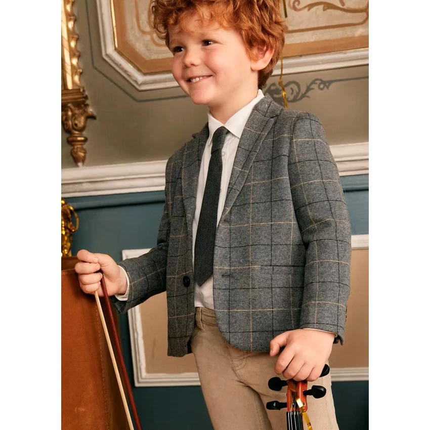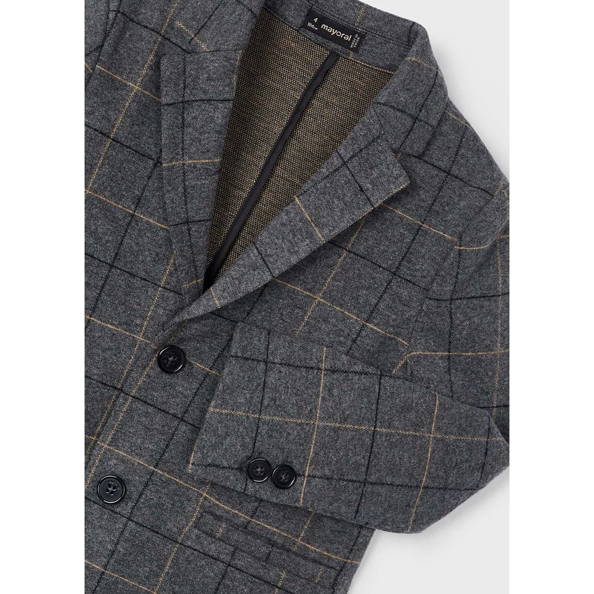 | Mayoral elegáns őszi zakó sötétszürke-kockás színben, gombokkal záródik, puha és elasztikus pamutkeverék anyagból készült , enyhén karcsúsított fazonnal, elöl 2 zsebbel. Az anyaga miatt nagyon kényelmes a kisfiúknak, emellett csinos és elegáns megjelenést kölcsönöz. | |