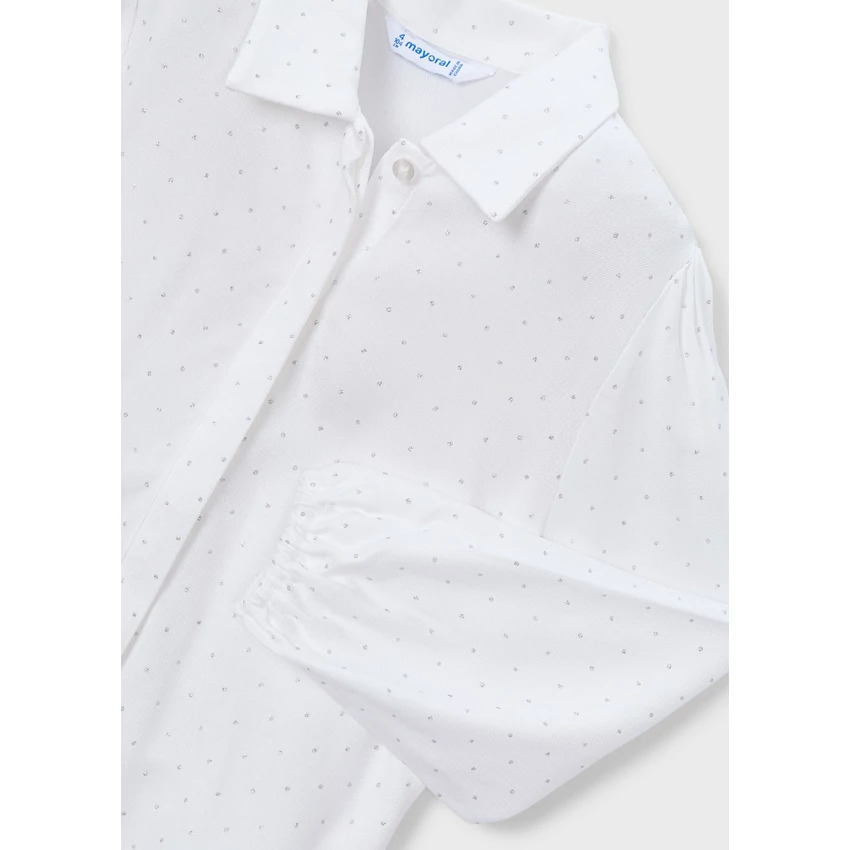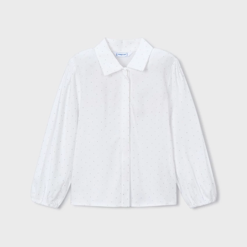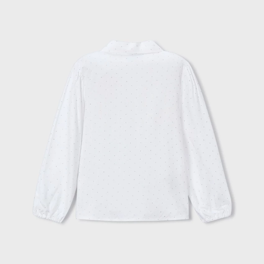 | Mayoral apró ezüst csillogó pöttyökkel díszített galléros blúz végig rejtett gombos, vállain csinos húzással, gumírozott ujjrésszel, extra puha viszkóz anyagból készült, csinos alkalmi viselet. 2025TÉL | |