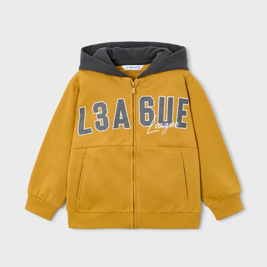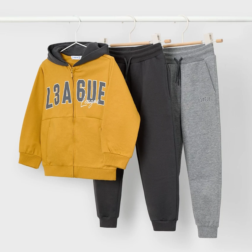 | Mayoral 3 részes sportos melegítő szett, ami egy kapucnis-cipzáras elöl sportos felirattal díszített pamut melegítő felsőből áll, elöl zsebekkel, bolyhos béléssel, és 2 darab gumis derekú megkötős vastagabb melegítő alsóból áll, gumírozott derékrésszel, megkötővel, zsebekkel, egyik nadrágon apró felirattal, belül bolyhos béléssel. Kényelmes őszi-téli viselet. | |