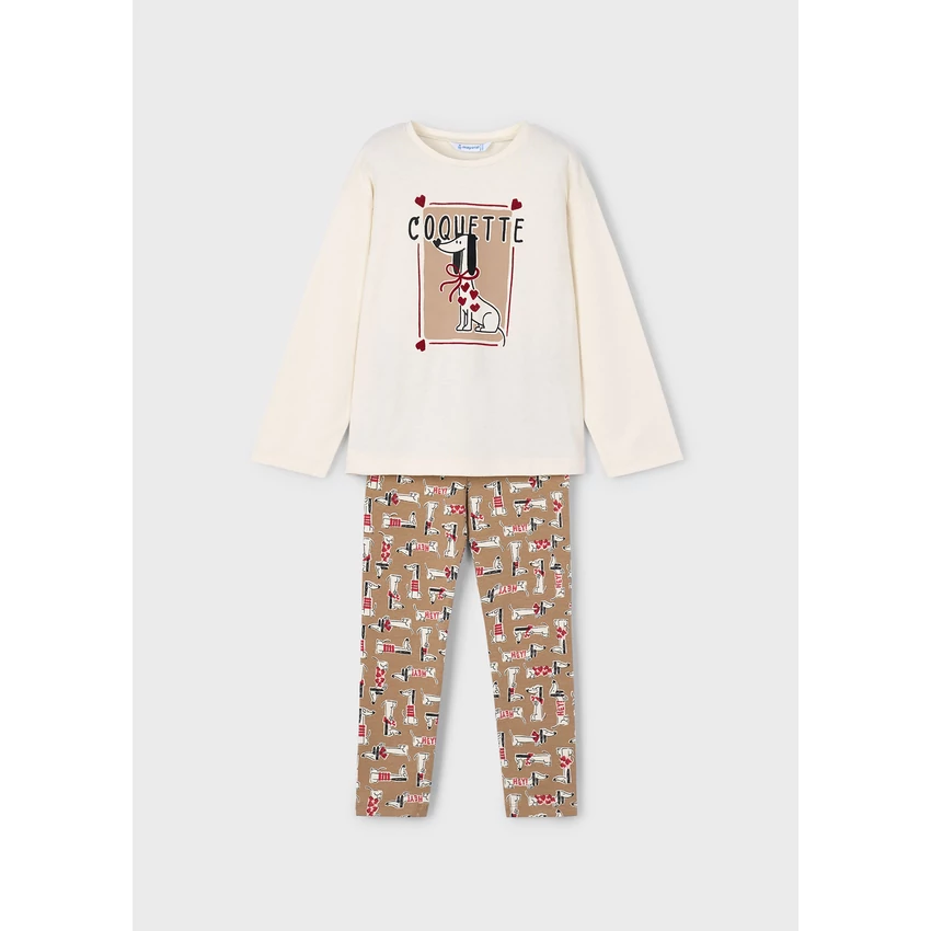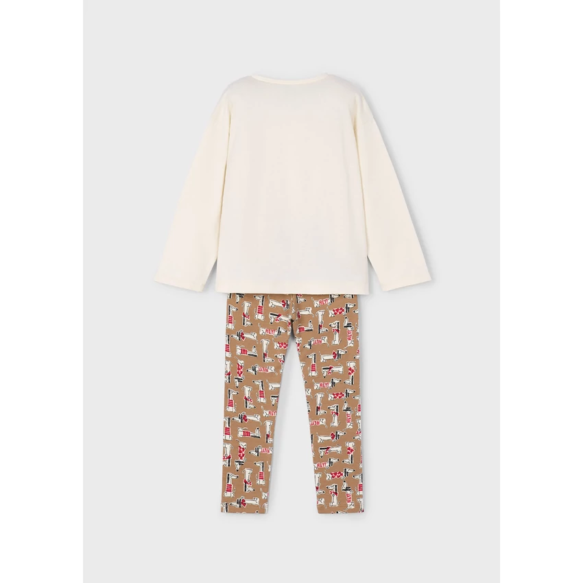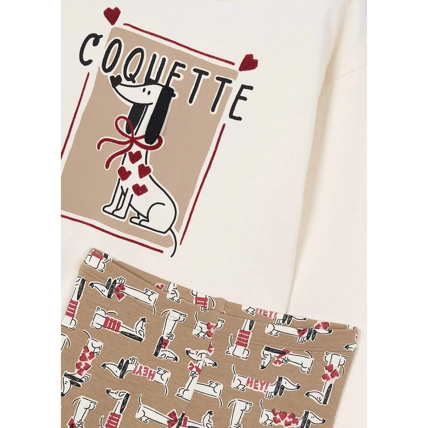 | Mayoral kétrészes kiskutyás szett, ami egy hosszú ujjú elöl kiskutya mintás pamut felsőből , és egy extra rugalmas anyagú kiskutya mintás vastagabb pamut leggingsből áll, belül bolyhos béléssel. Kényelmes és csinos hétköznapi viselet óvodába, iskolába. | |
