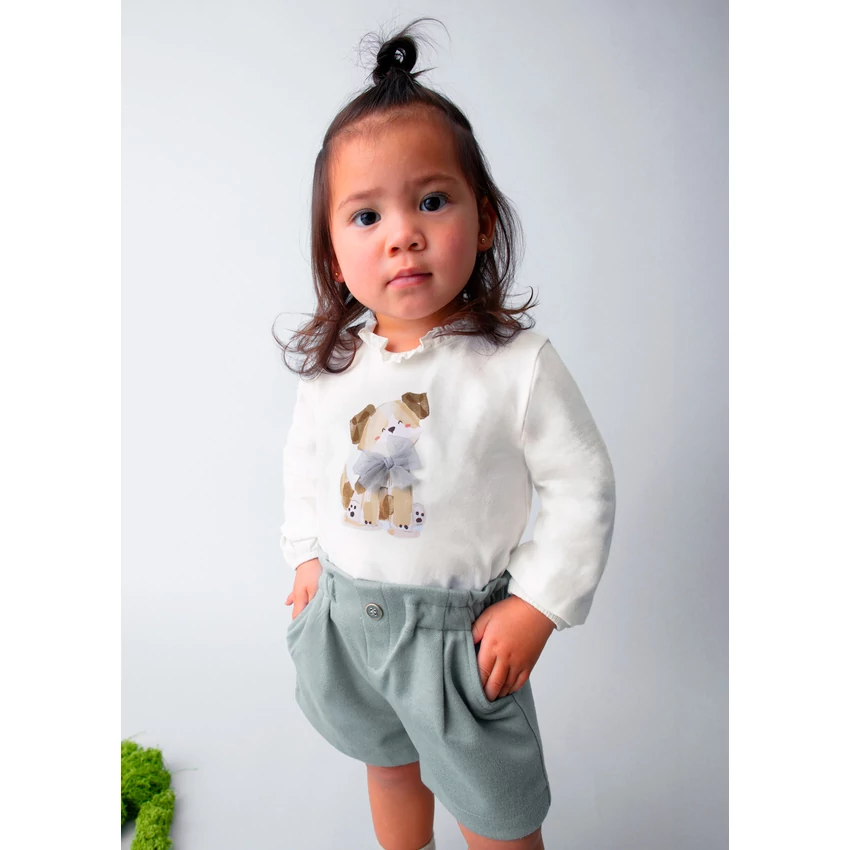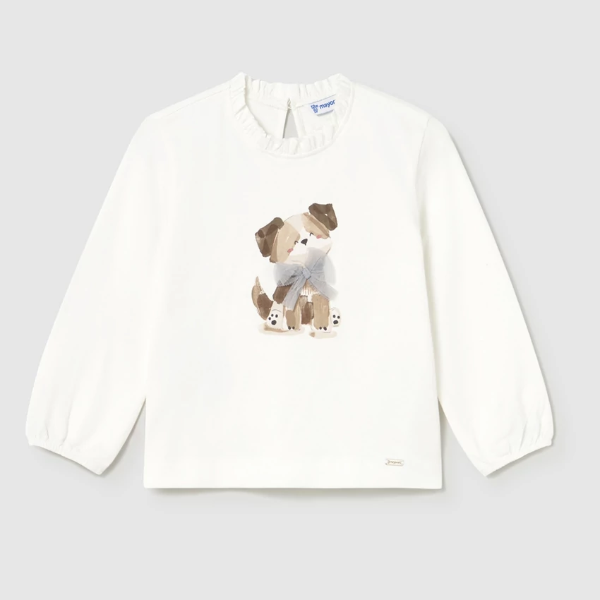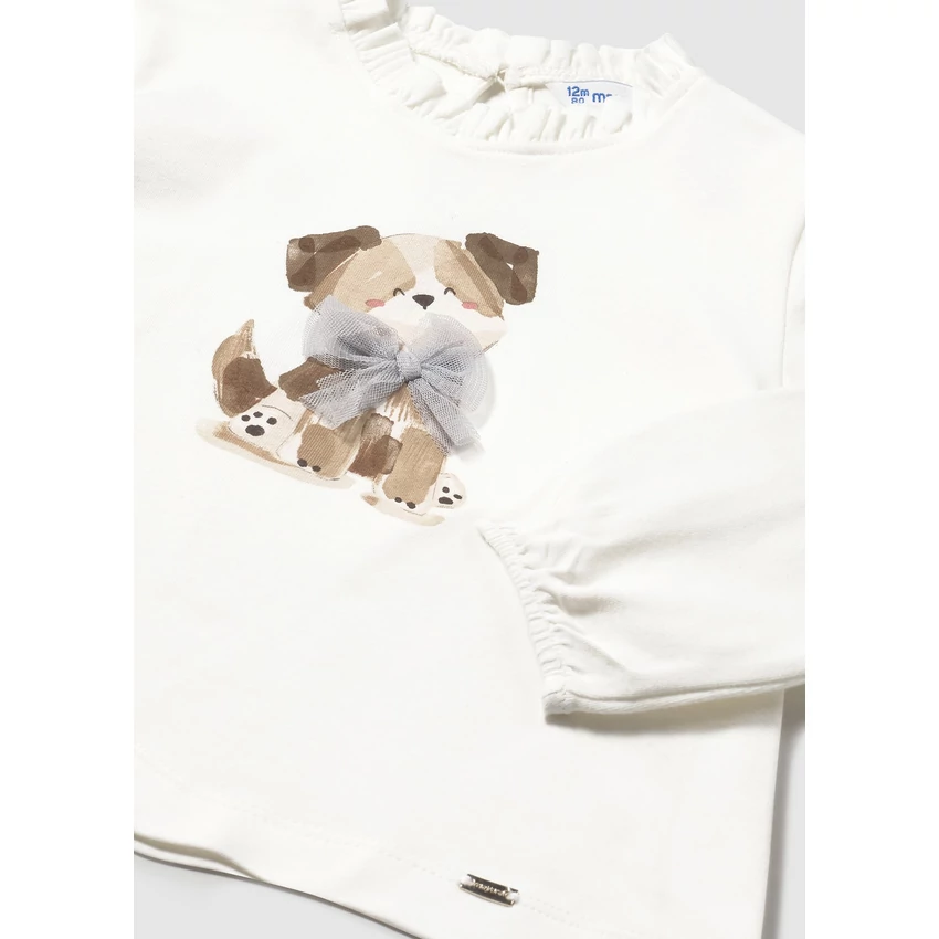Mayoral elegáns kiskutyás felső tüll masnival díszítve, csinos fodros nyakrésszel és gumírozott ujjal, extra rugalmas pamut anyagból készült, hátán 1 gombbal záródik. 2025 TÉL | |