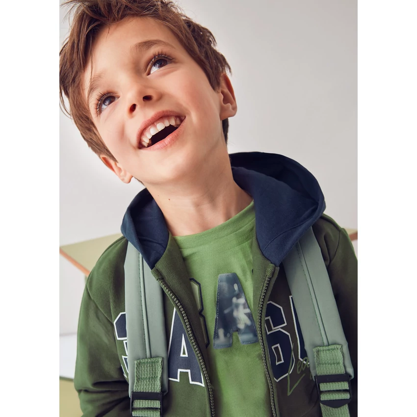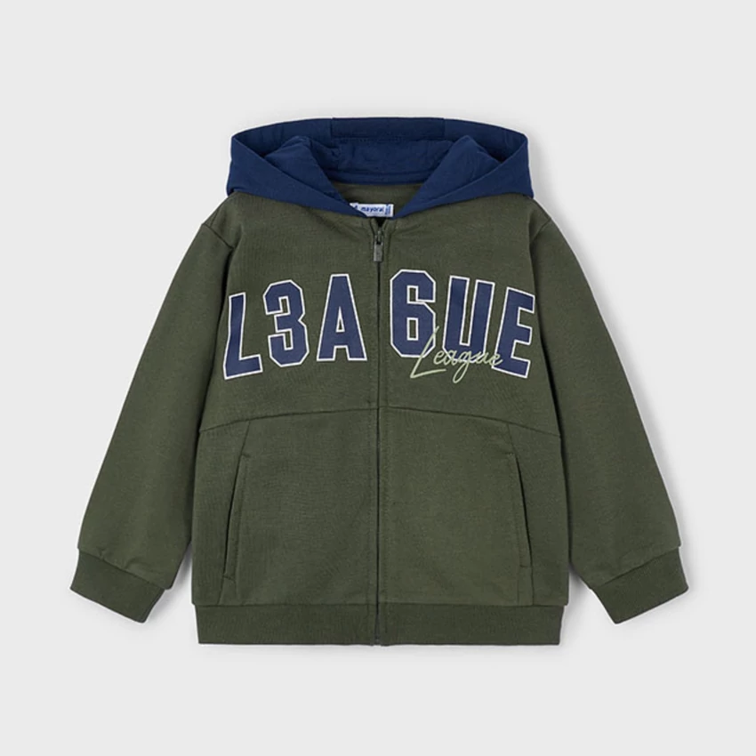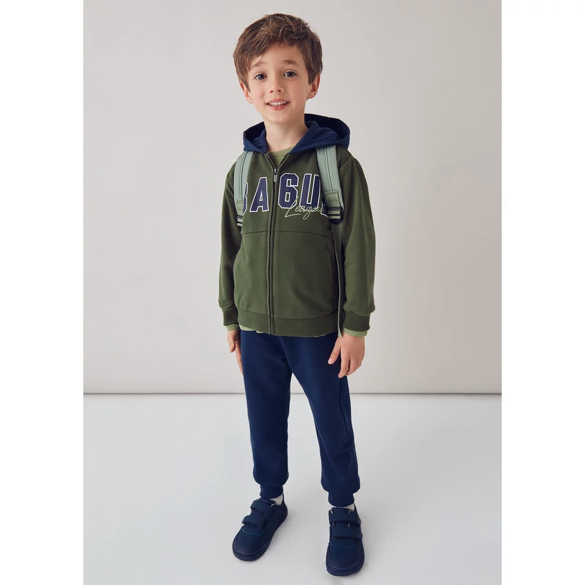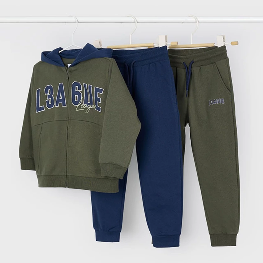 | Mayoral 3 részes sportos melegítő szett, ami egy kapucnis-cipzáras elöl sportos felirattal díszített pamut melegítő felsőből áll, elöl zsebekkel, bolyhos béléssel, és 2 darab gumis derekú megkötős vastagabb melegítő alsóból áll, gumírozott derékrésszel, megkötővel, zsebekkel, egyik nadrágon apró felirattal, belül bolyhos béléssel. Kényelmes őszi-téli viselet. | |