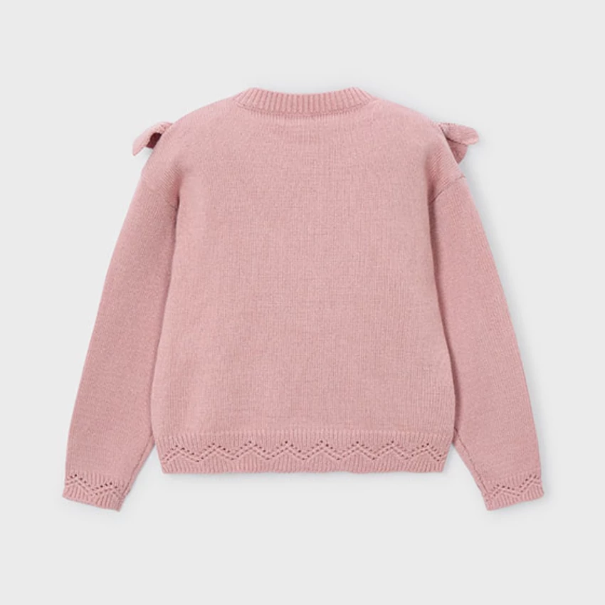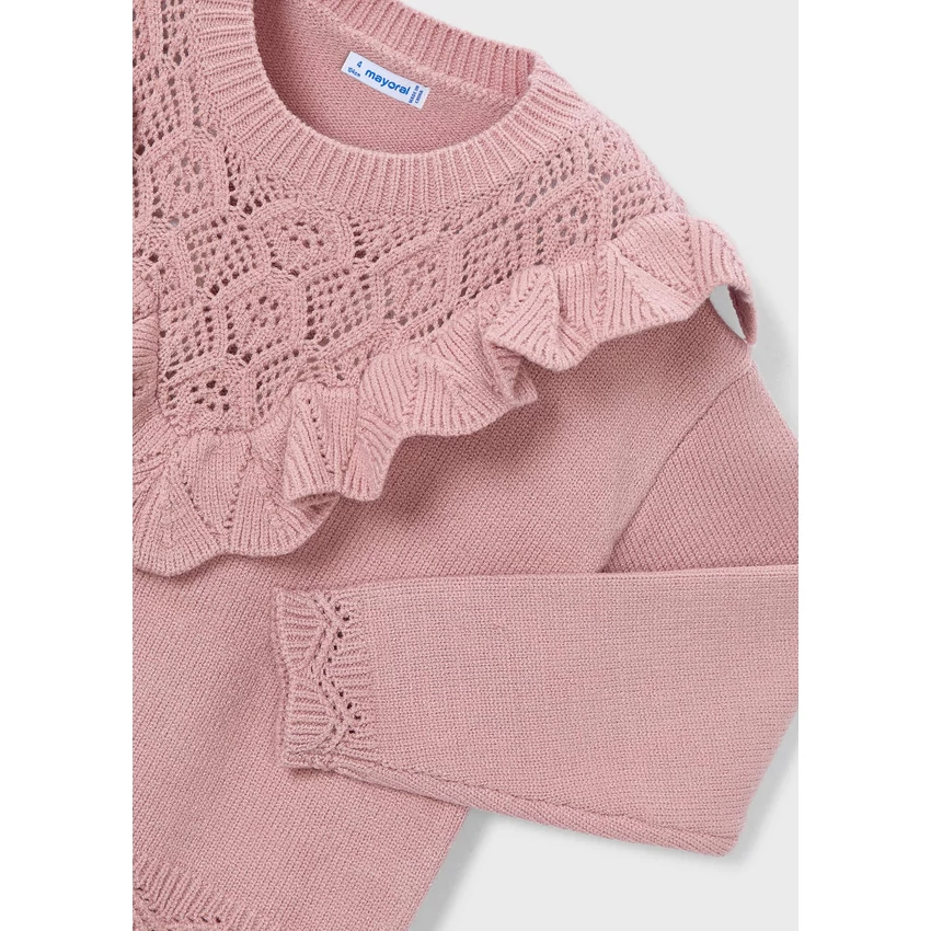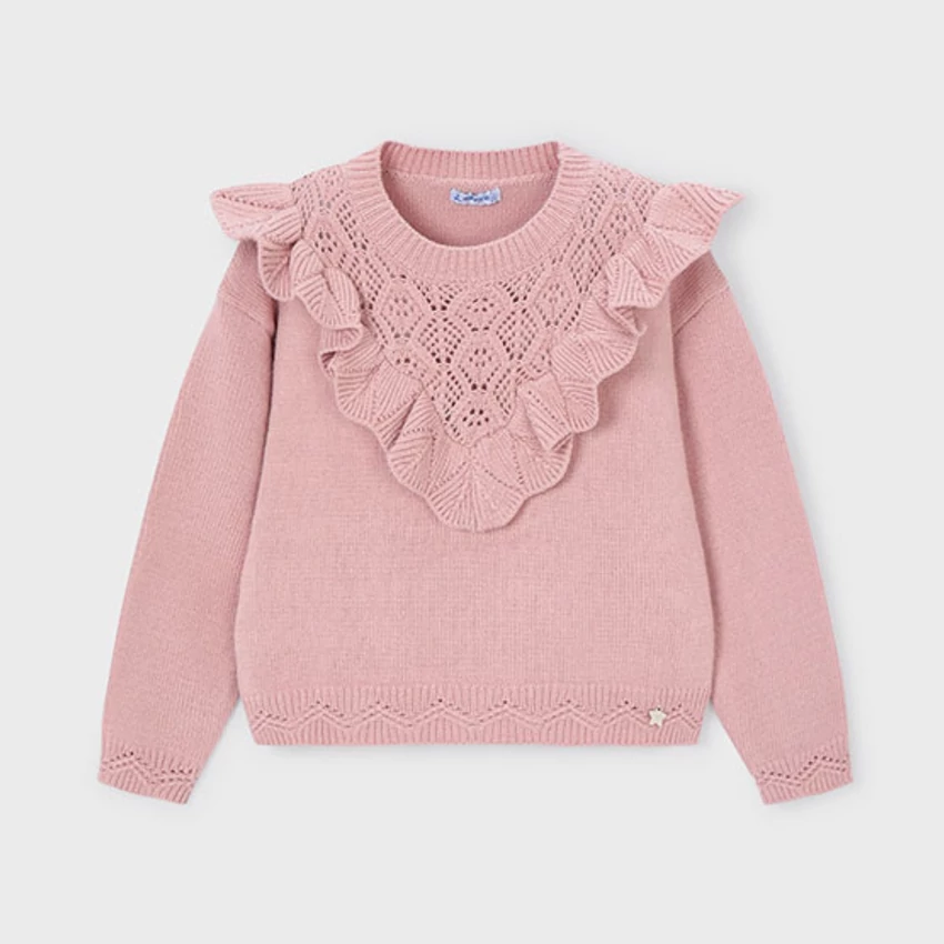 | Mayoral gyönyörű elöl fodorral díszített kötött pulóver pihe-puha finom kötött anyagból készült, kerek nyakkal, mellrésznél, ujjain és az alján lyukmintával díszített, nagyon egyedi csinos viselet őszre-télre. 2025 TÉL | |