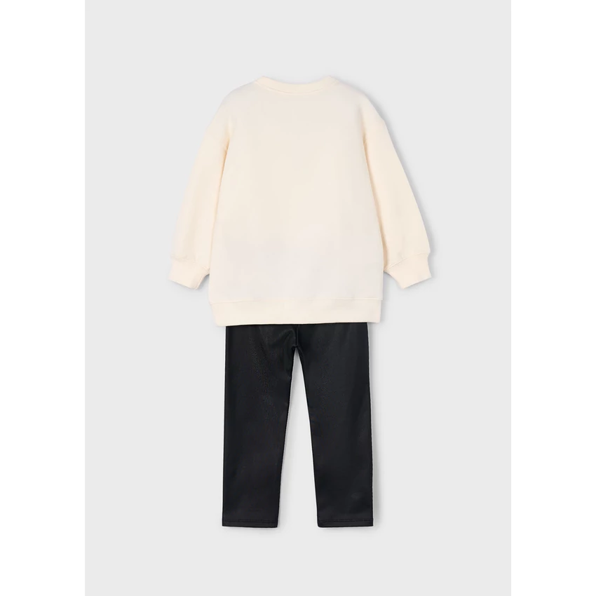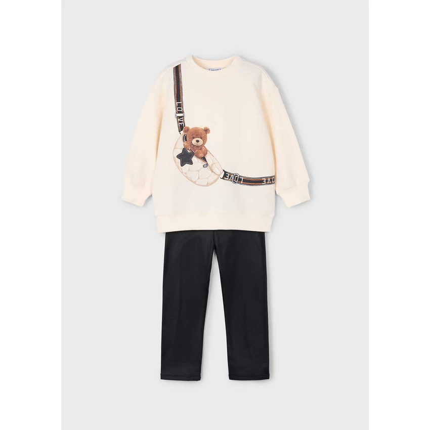 Mayoral csodaszép 2 részes szett, ami egy macis-övtáskás mintájú puha és rugalmas anyagú pamut pulóverből hosszabb fazonnal, pamut passzéval ujjain és derekán, illetve egy fekete fényes bőrhatású leggingsből áll, vastagabb anyagú, extra rugalmas és puha, gumírozott derékrésszel. Egyedi és csinos viselet őszre-télre. |