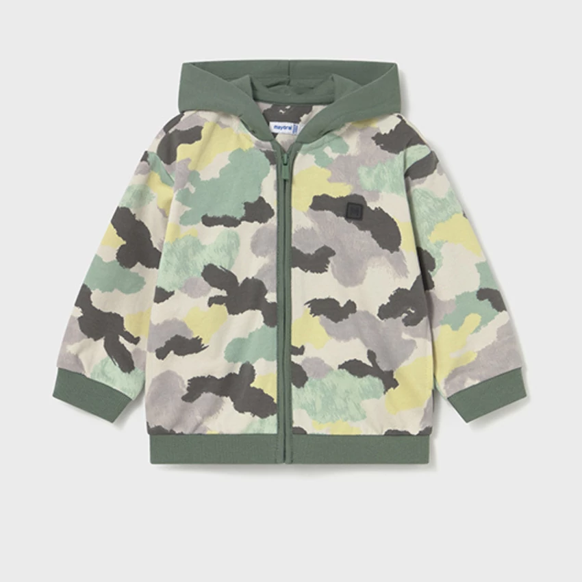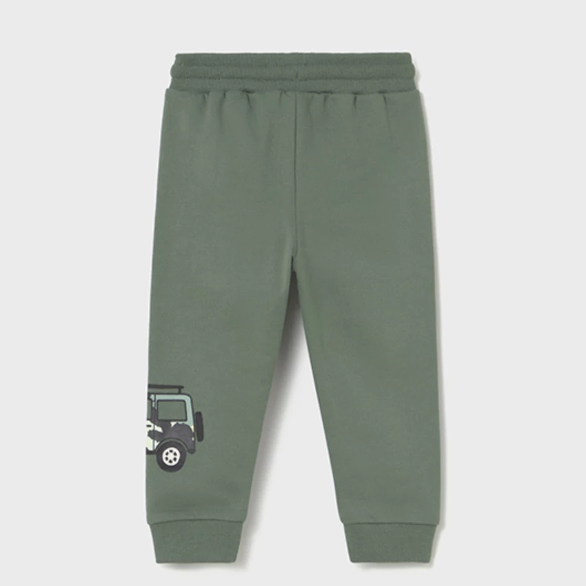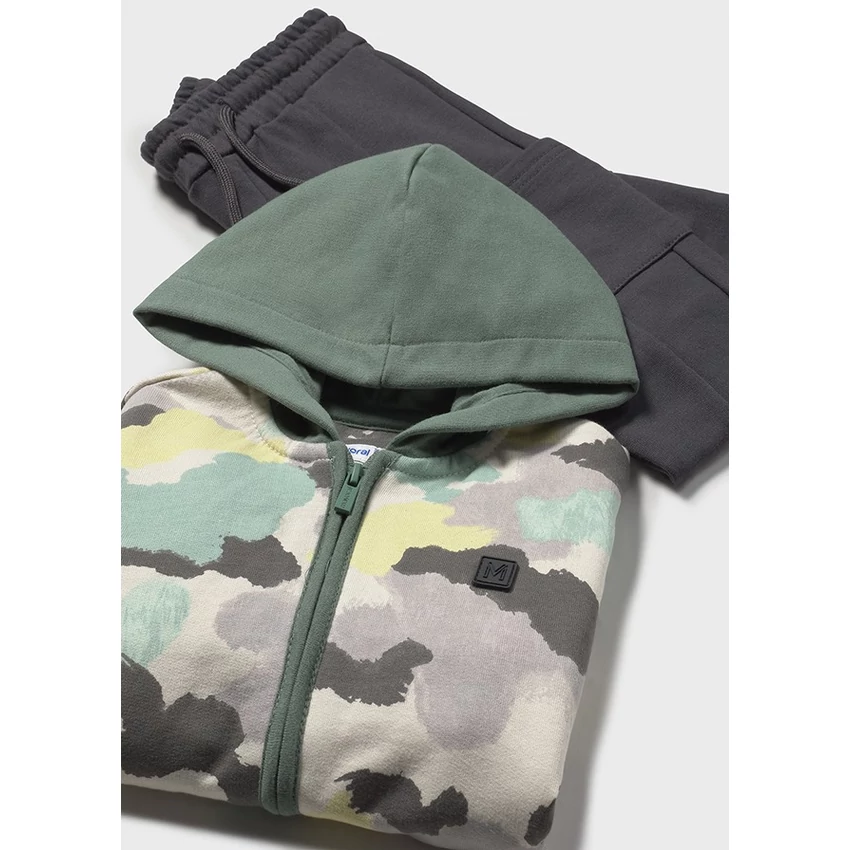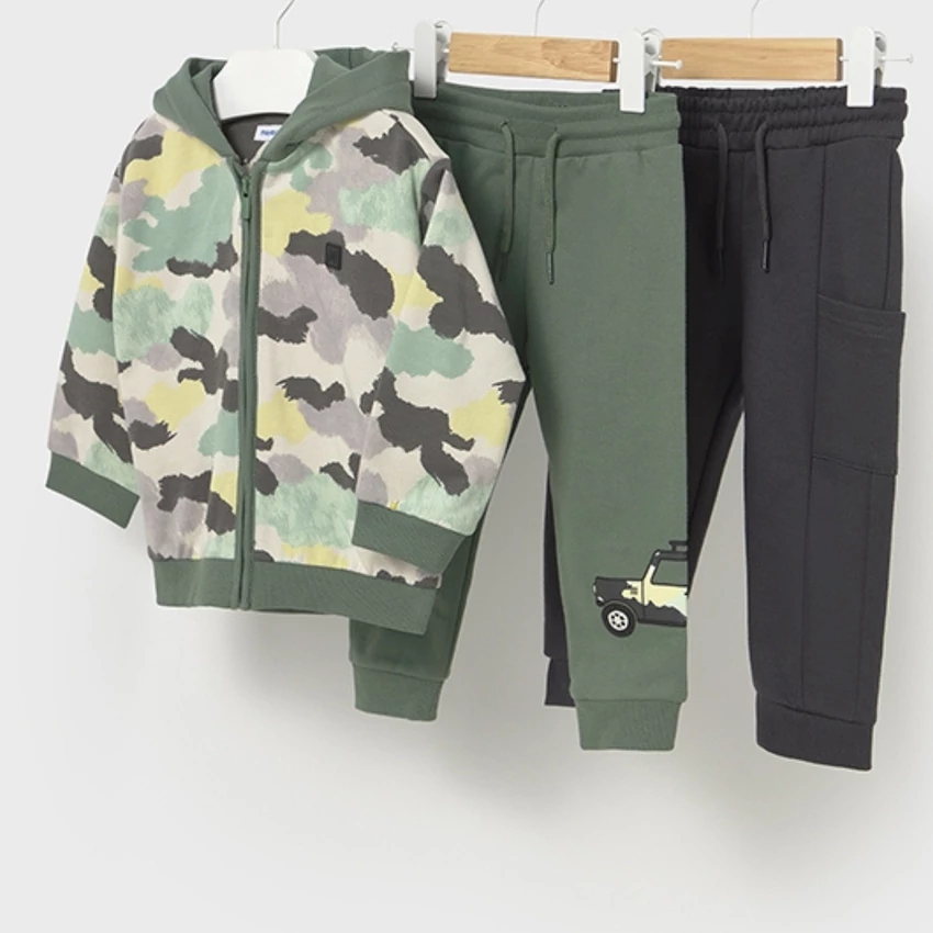 Mayoral 3 részes sportos melegítő szett, ami egy kapucnis-cipzáras mintás pamut melegítő felsőből, bolyhos béléssel, és 2 darab gumis derekú megkötős vastagabb melegítő alsóból áll, gumírozott derékrésszel, megkötővel, belül bolyhos béléssel. Az egyik szárán autómintával, a másik oldalán zsebekkel. Praktikus őszi-téli viselet puha és rugalmas pamutból. | |