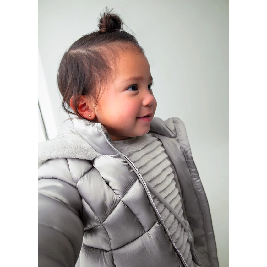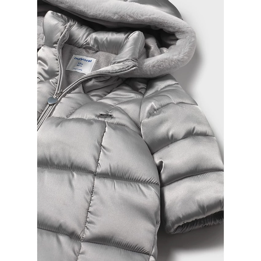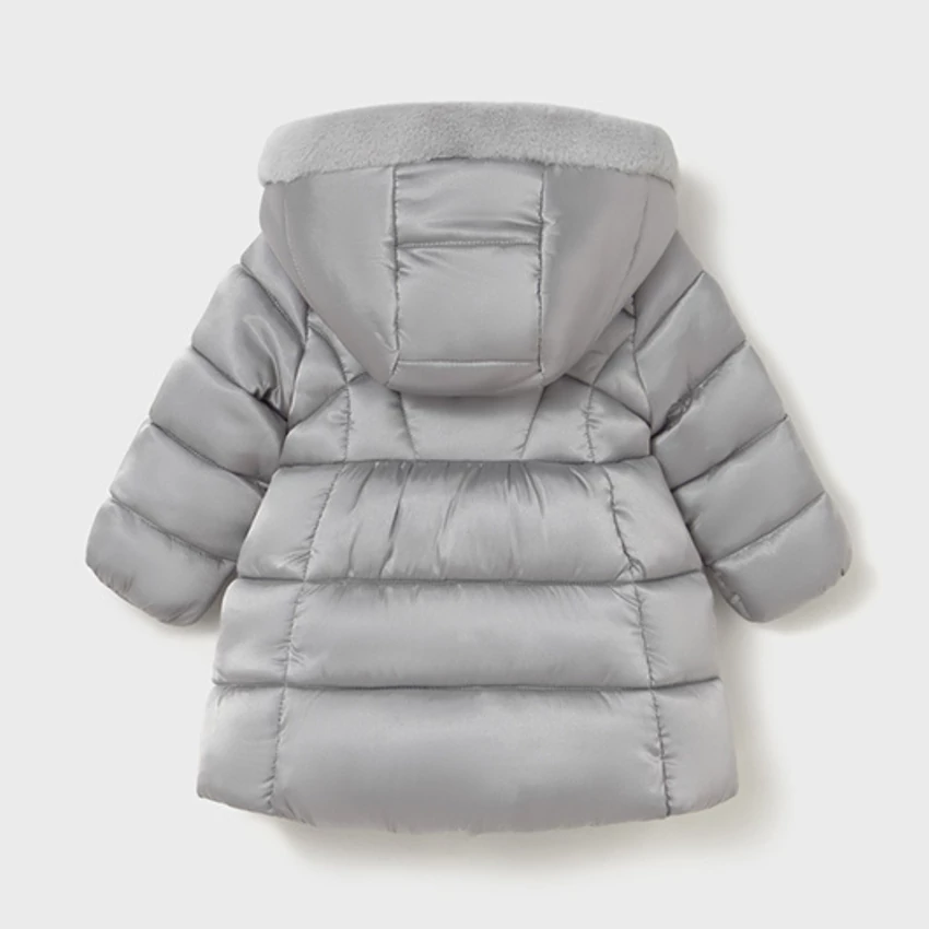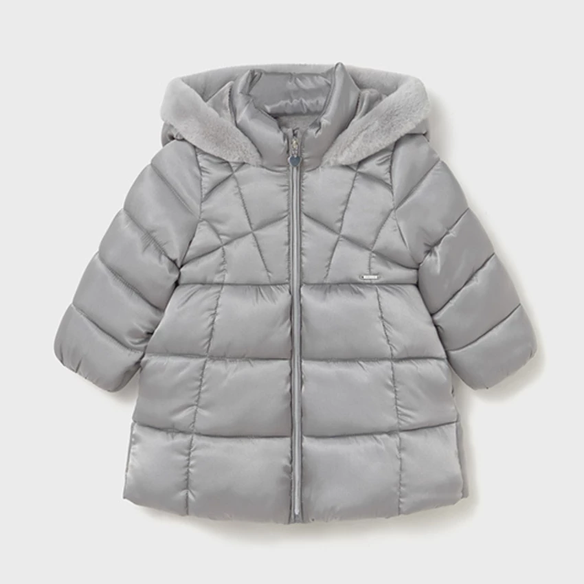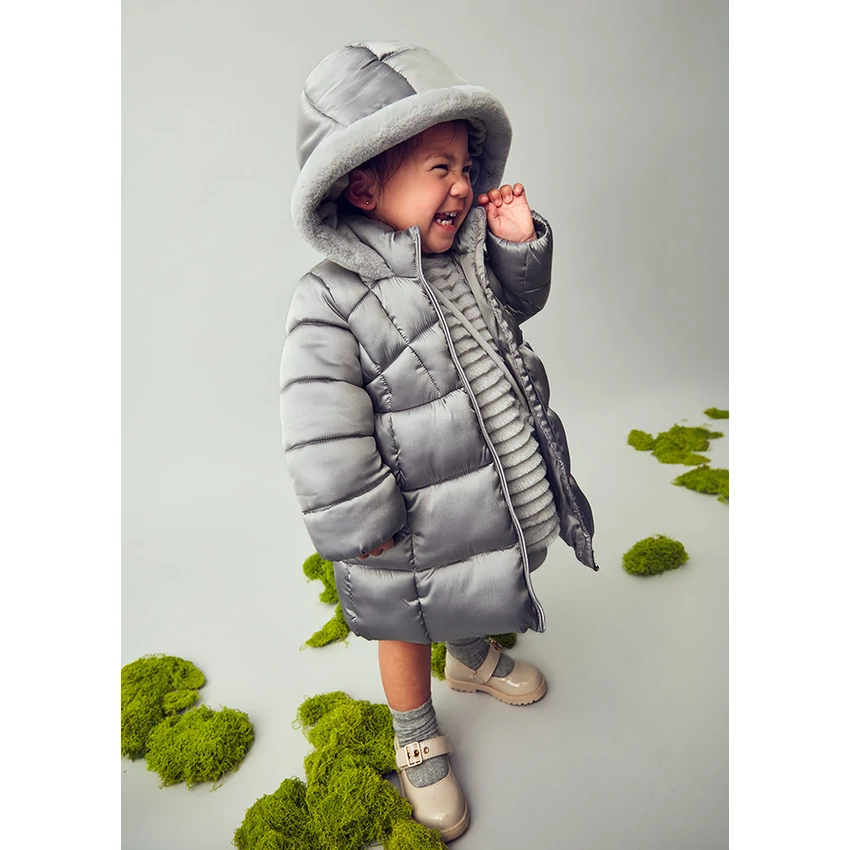Mayoral gyönyörű hosszú fazonú karcsúsított steppelt télikabát szőrmedíszítéses kapucnival, derékban karcsúsított csinos fazonú, cipzárral záródik, gumírozott ujjakkal, belül puha szürke szőrme béléssel, vastag töltettel. Csodaszép télikabát a legkisebbeknek. 2025 TÉL | |