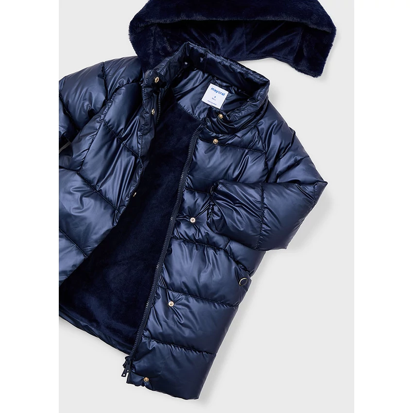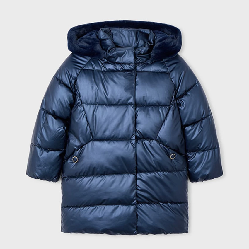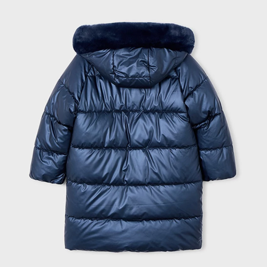 | Mayoral csodaszép hosszú fazonú szőrmés-kapucnis télikabát levehető kapucnival , cipzárral és rejtett patentokkal záródik, oldalán zsebekkel, amit egy-egy szép kis patent díszít, gumírozott ujjakkal, belül plüss béléssel, enyhén fényes steppelt anyagból, vastag töltettel, egyenes fazonnal. Kényelmes és csinos viselet télre. 2025 TÉL | |