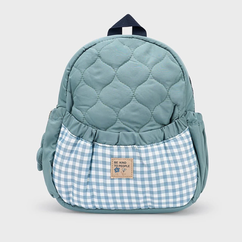 Mayoral puha steppelt anyagú kisméretű hátizsák állítható vállpántokkal, cipzárral záródik, elöl nagyméretű kockás rekesszel, mindkét oldalt italtartóval, belül egy belső zsebbel, cipzárján cuki virággal, ami lecsatolhat, hátsó része sötétkék. Méretei:. 26cmx24cmx10cm | |