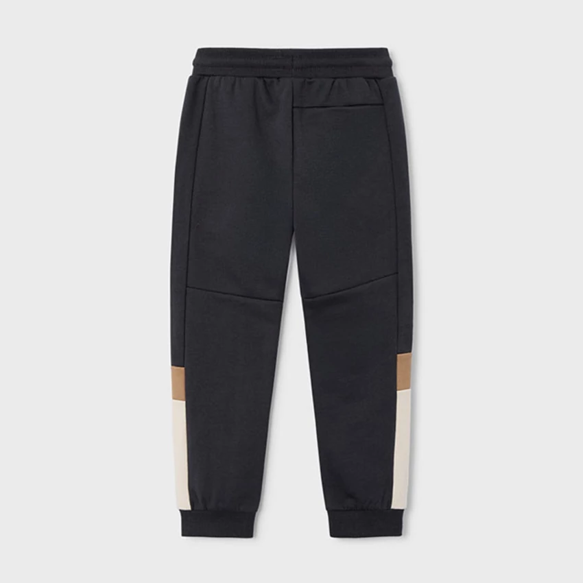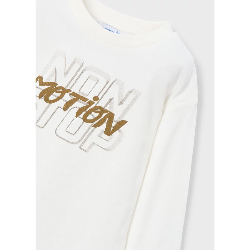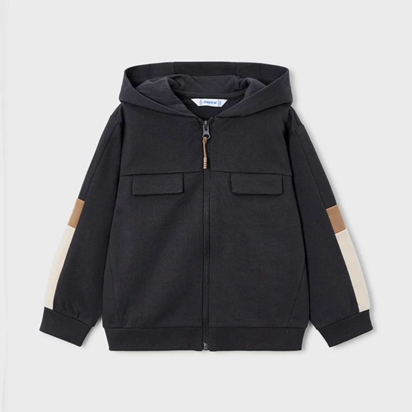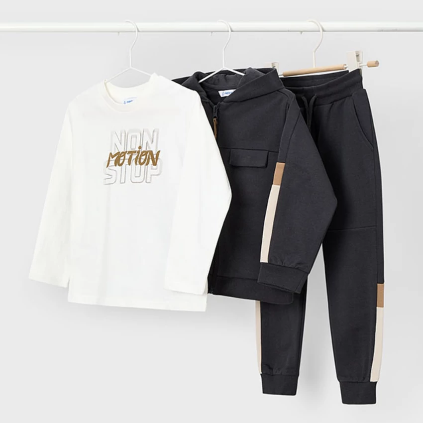 Mayoral 3 részes sportosan csinos melegítő szett, ami egy Non-stop Motion feliratos fehér hosszú ujjú felsőből, egy kapucnis-cipzáras ujján színes betéttel díszített pamut melegítő felsőből áll, elöl zsebekkel, bolyhos béléssel, és 1 gumis derekú megkötős vastagabb melegítő alsóból áll, gumírozott derékrésszel, megkötővel, zsebekkel, egyik lábszárán oldalt szintén színes betéttel díszített. belül bolyhos béléssel. Nagyon szép és kényelmes őszi-téli viselet. A melegítő színe sötét szürkésfekete, bézs-fehér betéttel. |