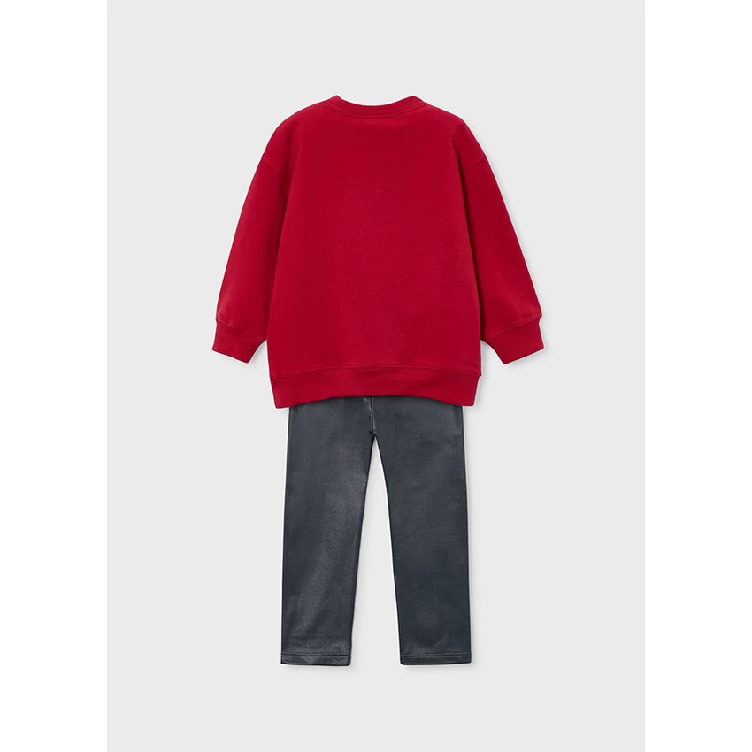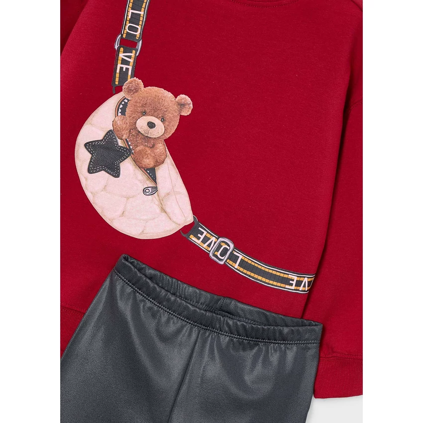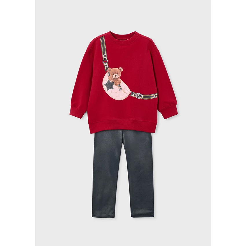 Mayoral csodaszép 2 részes szett, ami egy macis-övtáskás mintájú puha és rugalmas anyagú pamut pulóverből hosszabb fazonnal, pamut passzéval ujjain és derekán, illetve egy sötétszürke fényes bőrhatású leggingsből áll, vastagabb anyagú, extra rugalmas és puha, gumírozott derékrésszel. Egyedi és csinos viselet őszre-télre. |