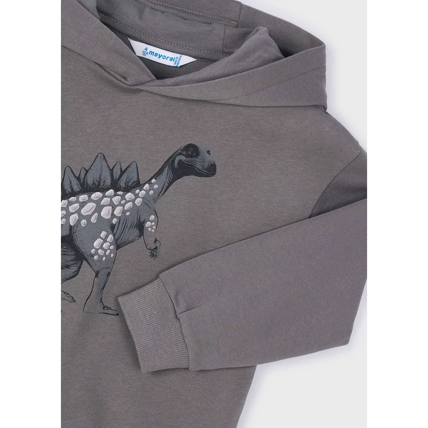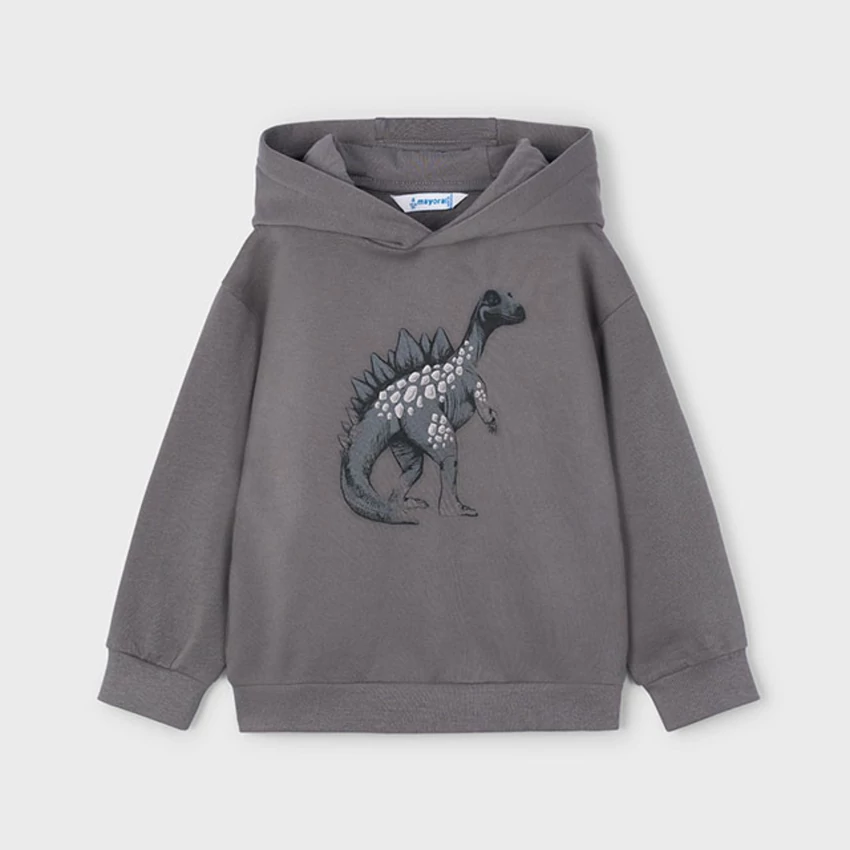 Mayoral vagány elöl nyomott dínómintás kapucnis pulóver pamut passzéval az ujjain és derekán, enyhén rugalmas puha pamutból készült, belül bolyhos béléssel, egyedi őszi-téli viselet kis és nagyfiúknak. 2025 TÉL | |