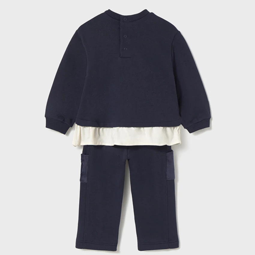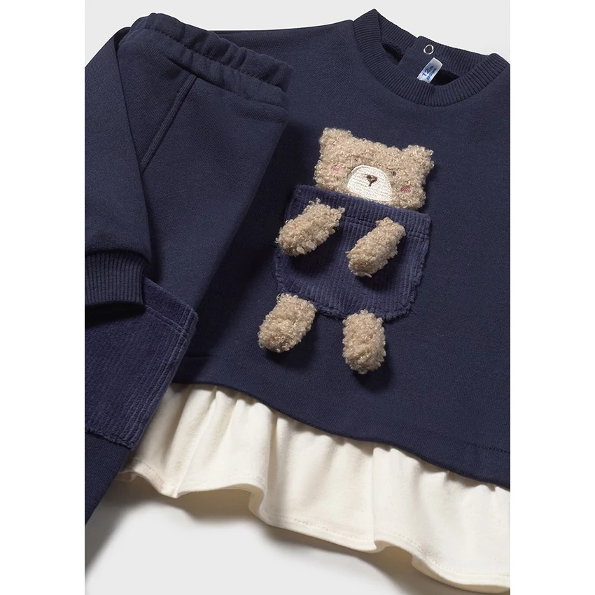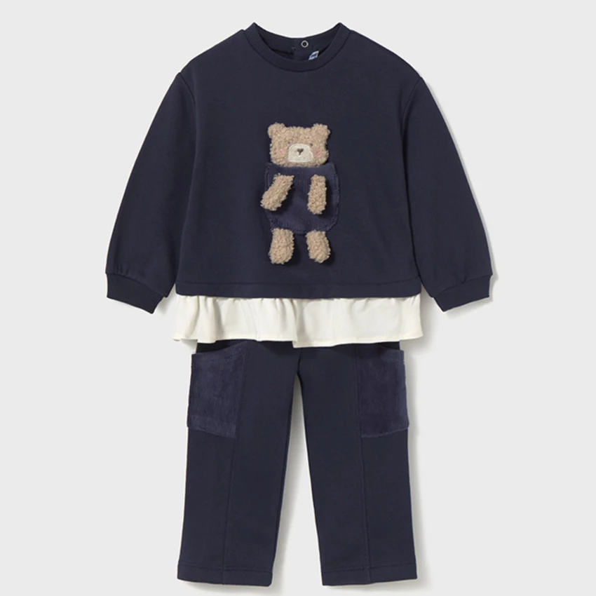 Mayoral kétrészes meleg szett, ami egy elöl szőrmés macival díszített meleg pulóverből áll, alul ing rész teszi egyedivé, hátán néhány patenttal nyitható, meleg bolyhos béléssel, rugalmas pamutból, illetve egy vastag gumis derekú nadrágból áll, aminek oldalzsebei korddal díszítettek, szintén vastag anyagú belül bolyhos béléssel. Csinos és kényelmes viselet őszre-télre. | |