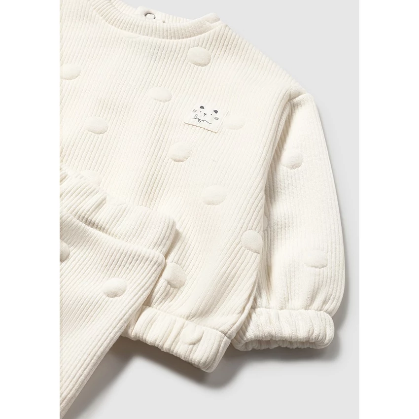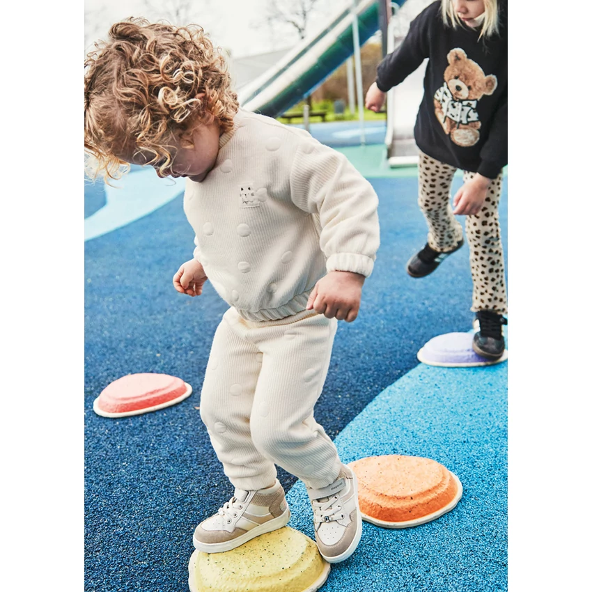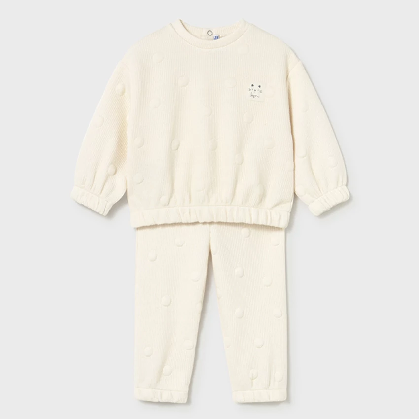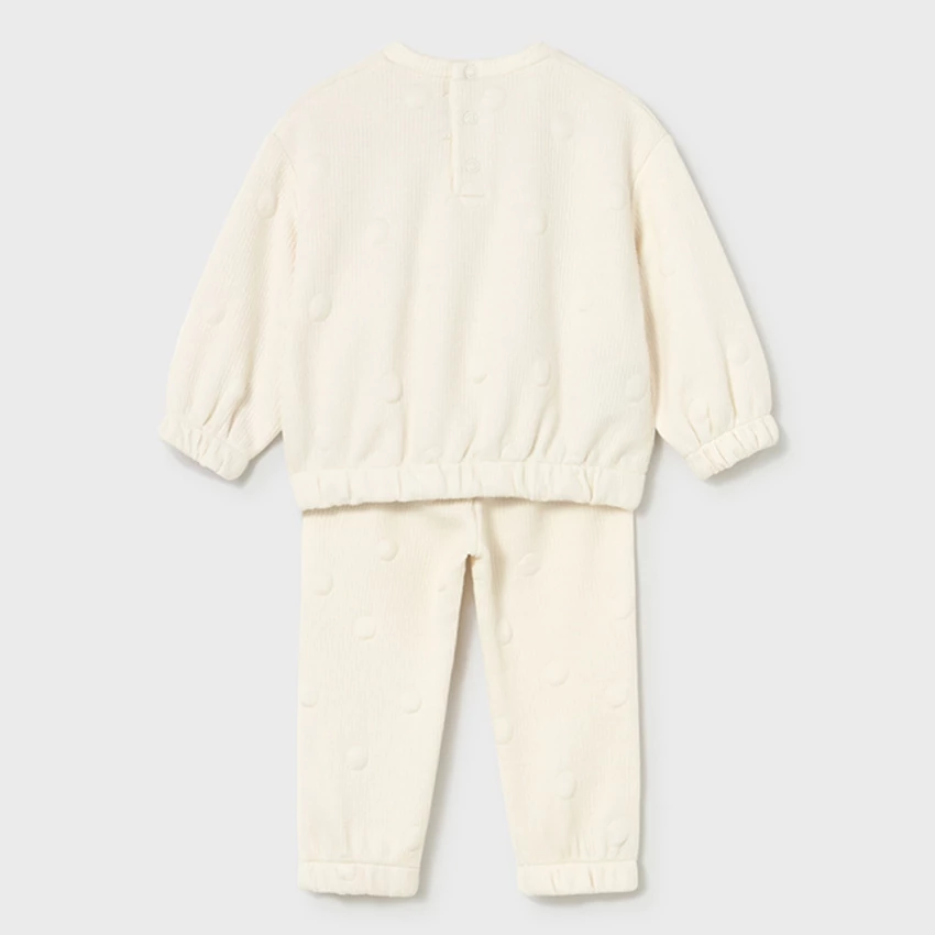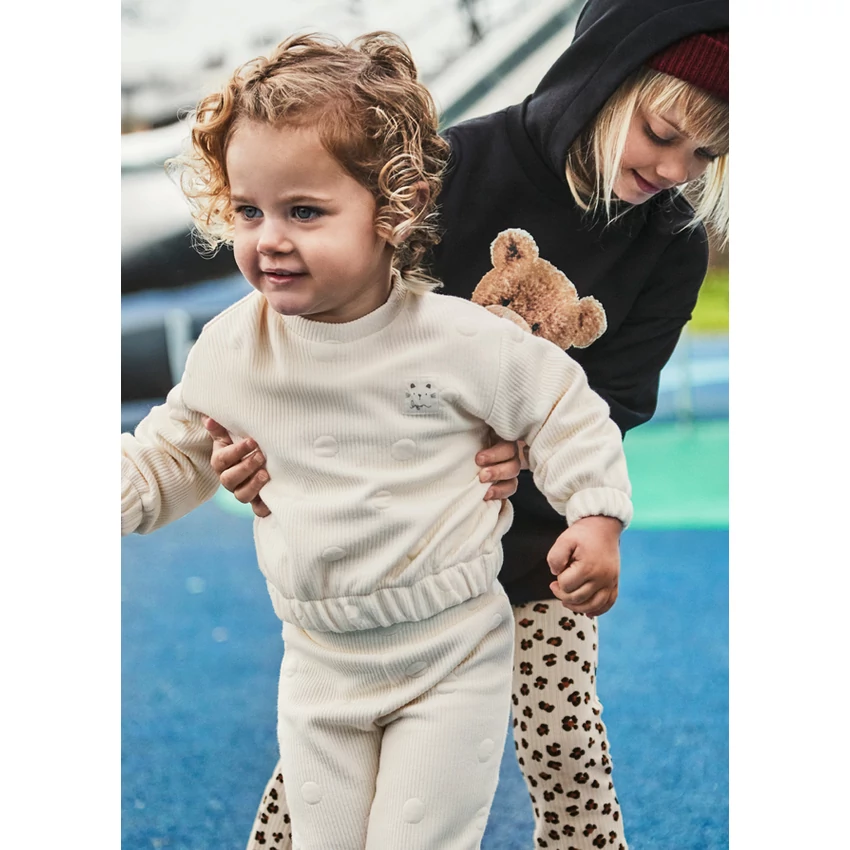 Mayoral csodaszép kétrészes melegítő szett, ami egy anyagában körmintával díszített vastagabb és nagyon rugalmas anyagú pulóverből áll, rövidebb fazonú gumírozott ujjakkal és derékrésszel, különleges szuperjó meleg anyagból, és egy gumírozott derekú szintén extra puha és rugalmas nadrágból áll, lábszáránál szintén gumírozott.. Az egyik legszebb, legkényelmesebb termék idén. | |