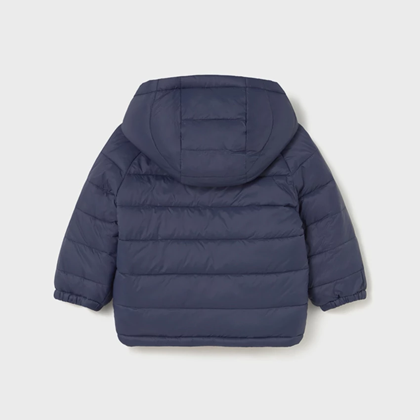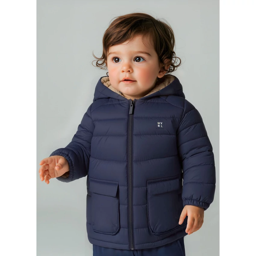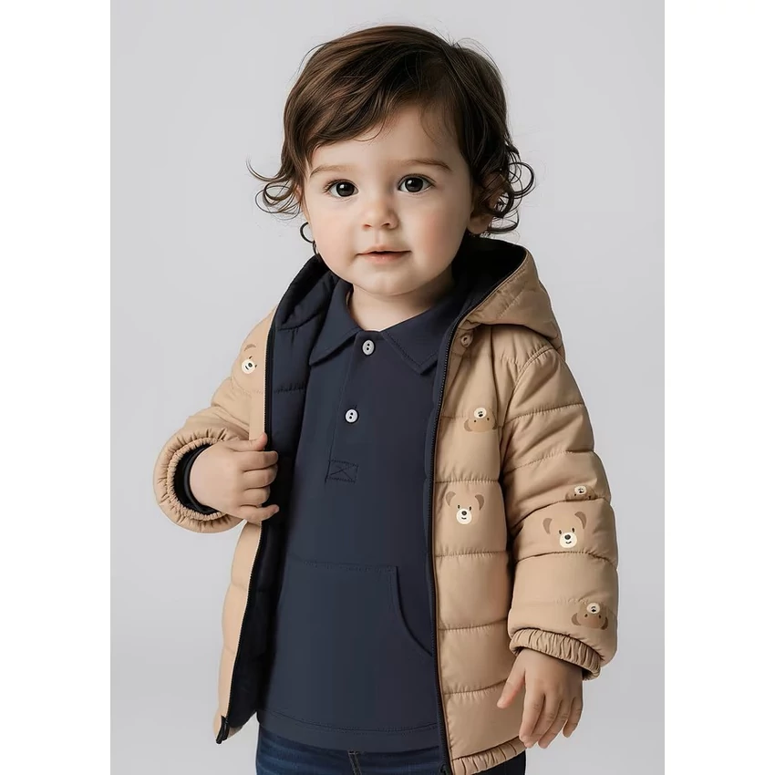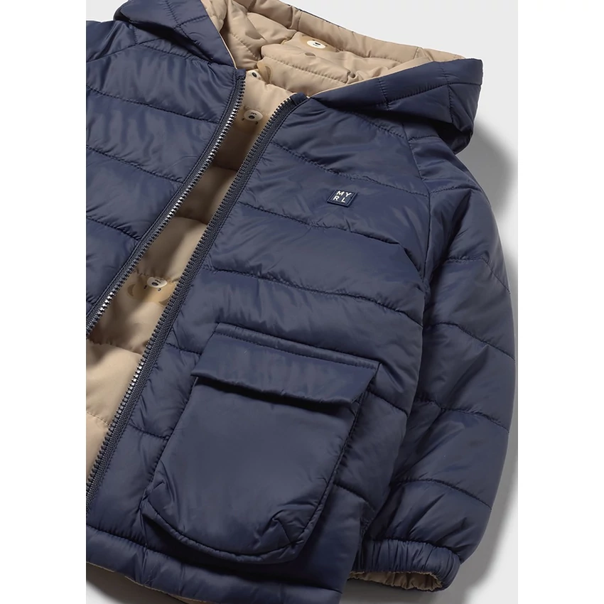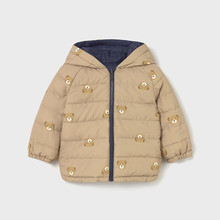 Mayoral kifordítható steppelt átmeneti kabát vastag töltettel, kapucnival, cipzárral záródik, egyik oldala bézs alapon macimintás, másik oldala sötétkék , nagyméretű zsebekkel ezen az oldalán, gumírozott ujjakkal és derékrésszel. Tökéletes viselet hidegebb őszi enyhébb téli napokra. 2025 TÉL | |