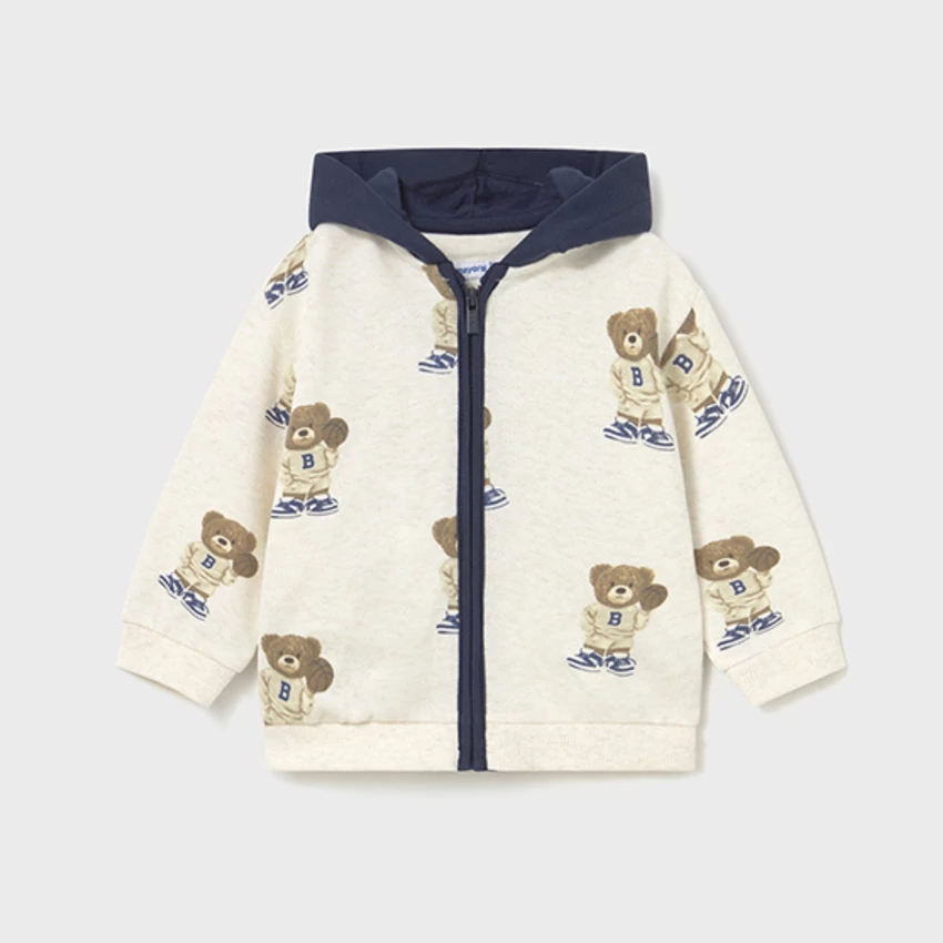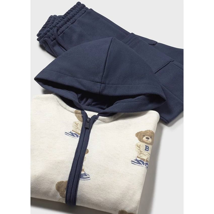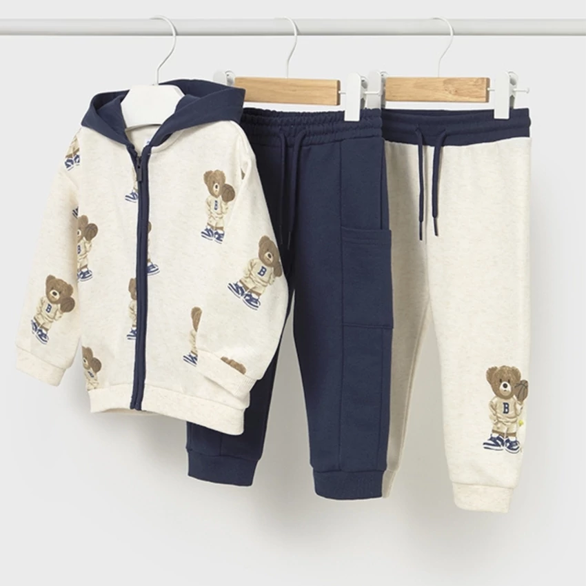 Mayoral 3 részes macimintás melegítő szett, ami egy kapucnis-cipzáras macimintás pamut melegítő felsőből, bolyhos béléssel, és 2 darab gumis derekú megkötős vastagabb melegítő alsóból áll, gumírozott derékrésszel, megkötővel, belül bolyhos béléssel. Az egyik lábszáránál macimintás, a másik egyszínű oldalán zsebekkel. Praktikus őszi-téli viselet puha és rugalmas pamutból. |