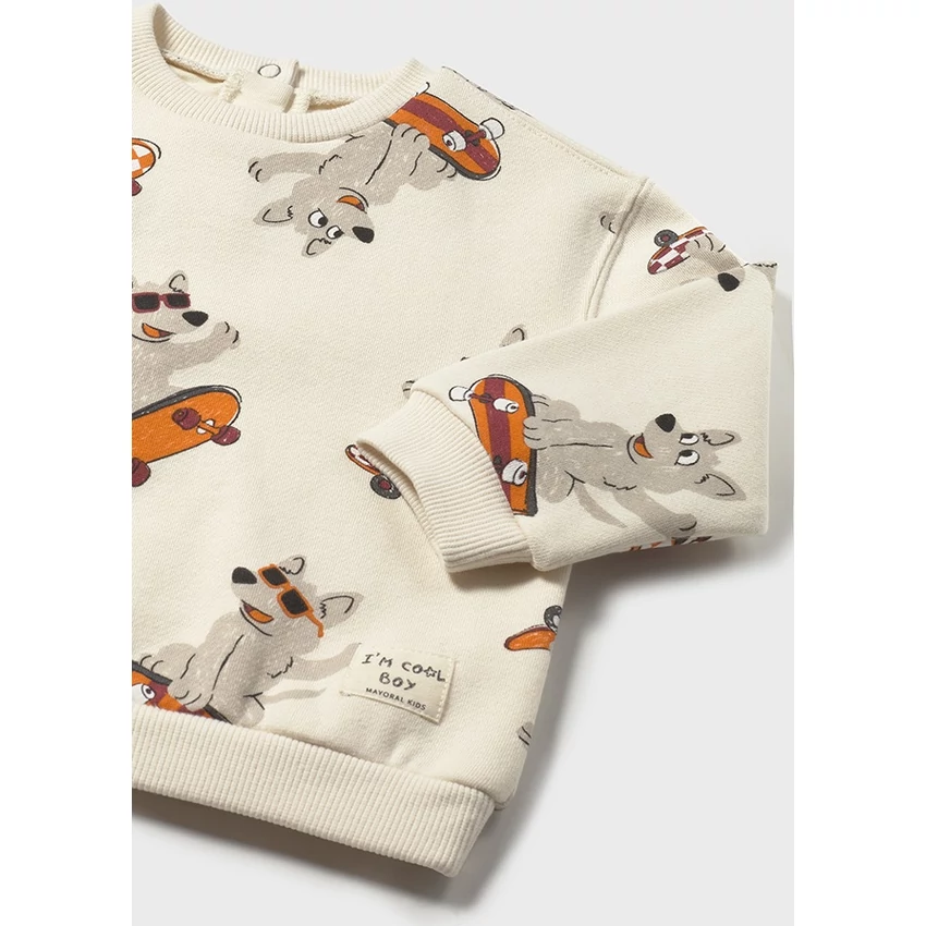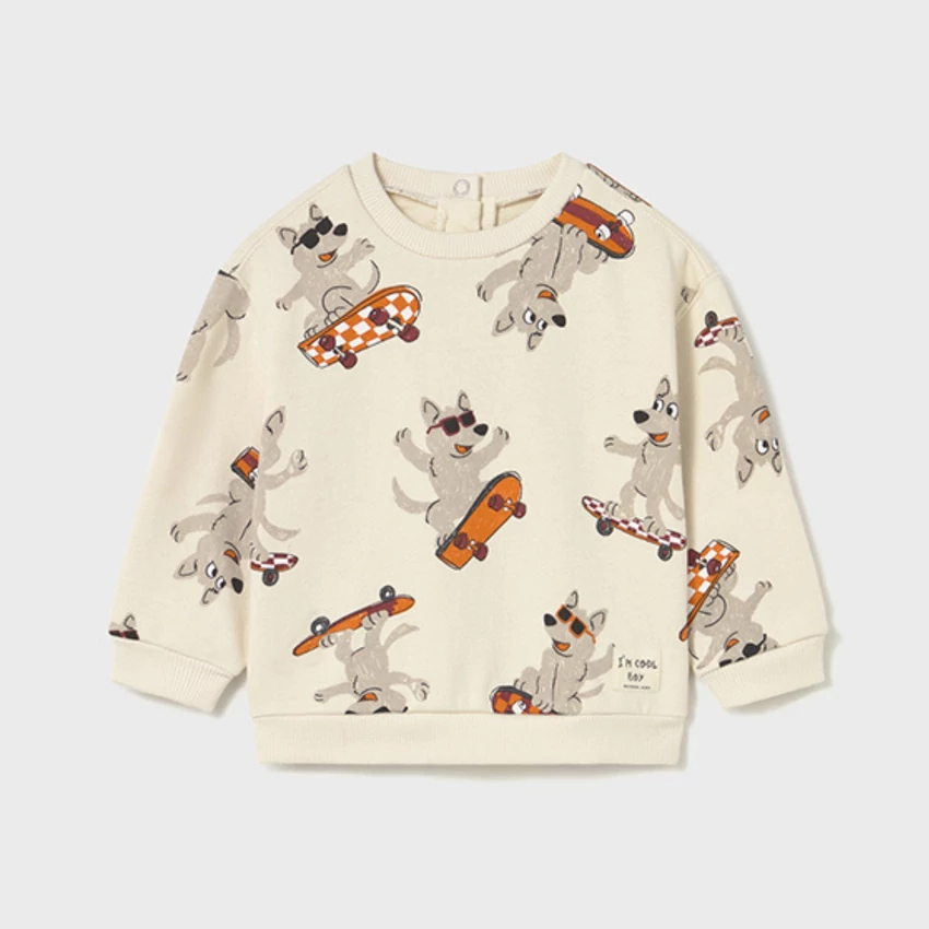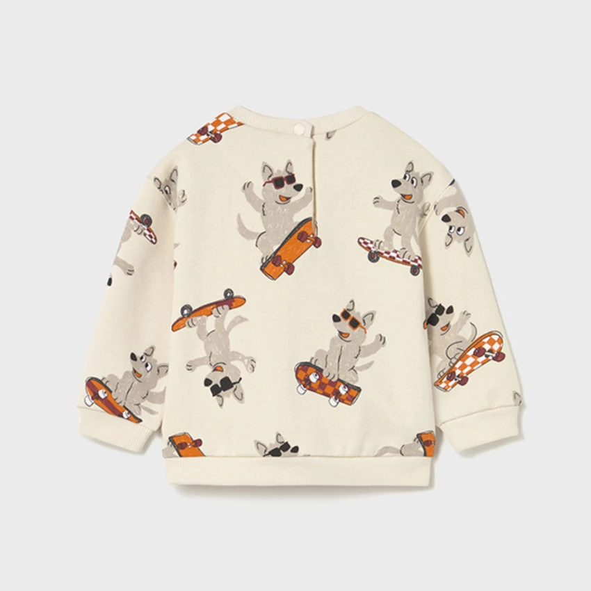 Mayoral elöl-hátul vagány kiskutya mintás pamut pulóver kerek nyakkal, pamut passzéval az ujjain és derekán, belül bolyhos béléssel, enyhén rugalmas pamutból készült, hátán patentokkal nyitható. 2025 TÉL | |