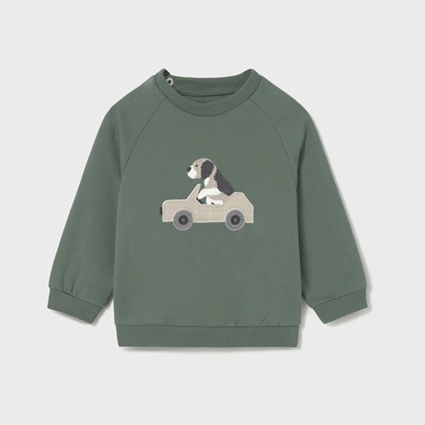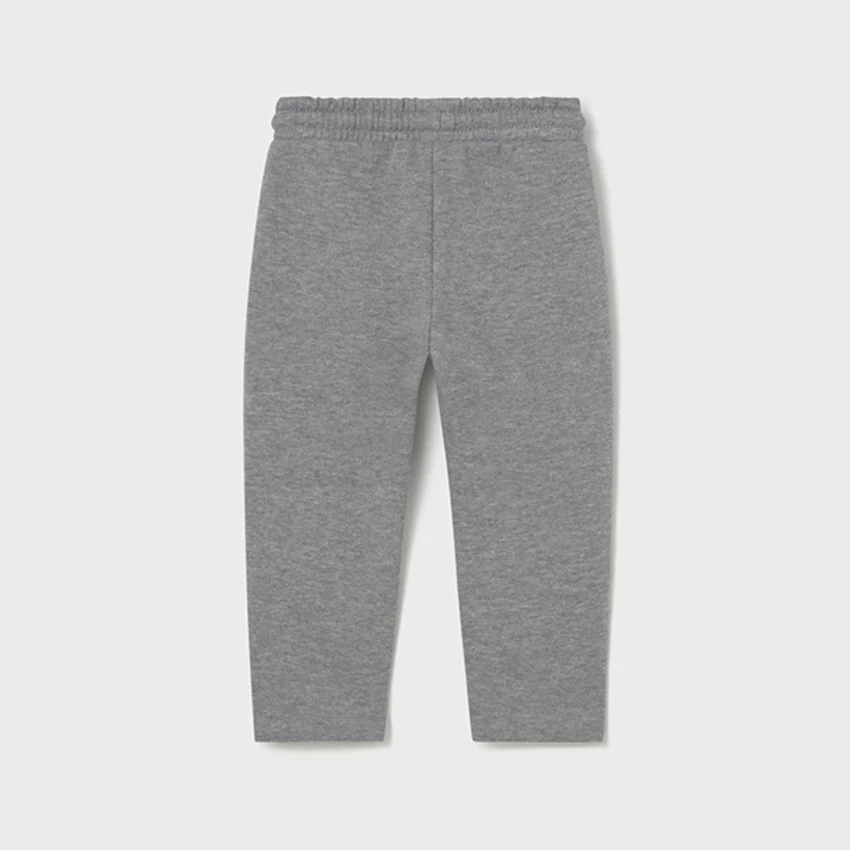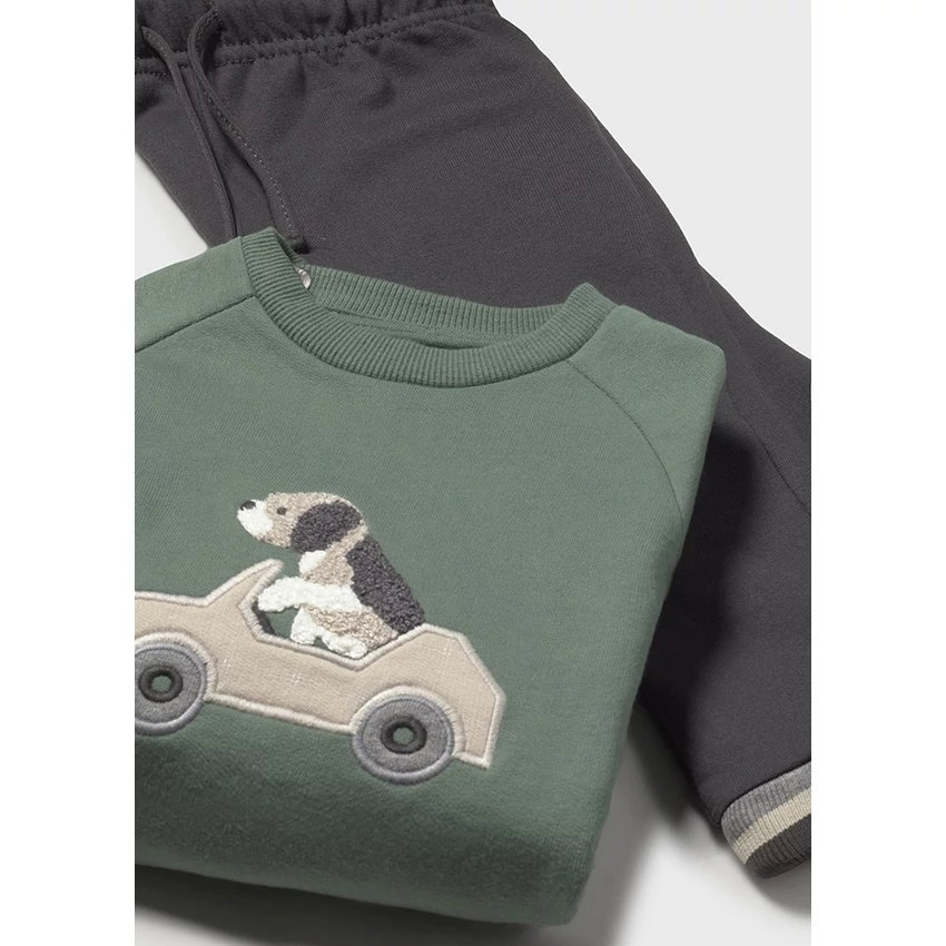 Mayoral 3 részes melegítő szett, ami egy kerek nyakú elöl állatkás pamut melegítő felsőből, bolyhos béléssel, és 2 gumis derekú megkötős vastagabb melegítő alsóból áll, gumírozott derékrésszel, megkötővel, belül bolyhos béléssel. az egyik lábszáránál csíkos passzéval díszített. Praktikus őszi-téli viselet puha és rugalmas pamutból. | |