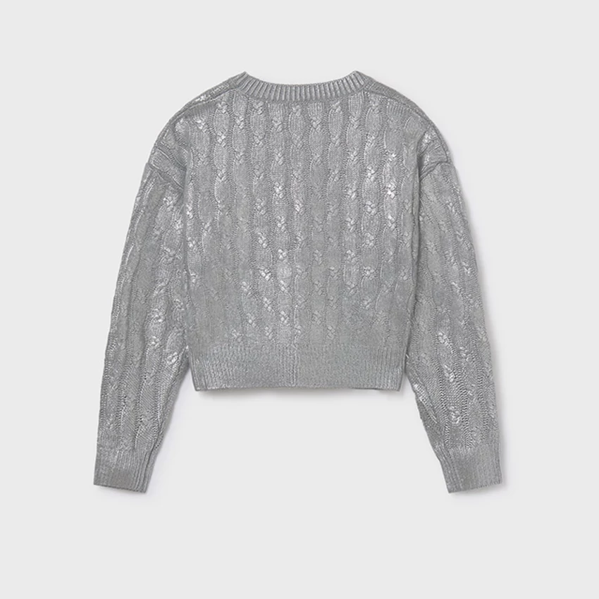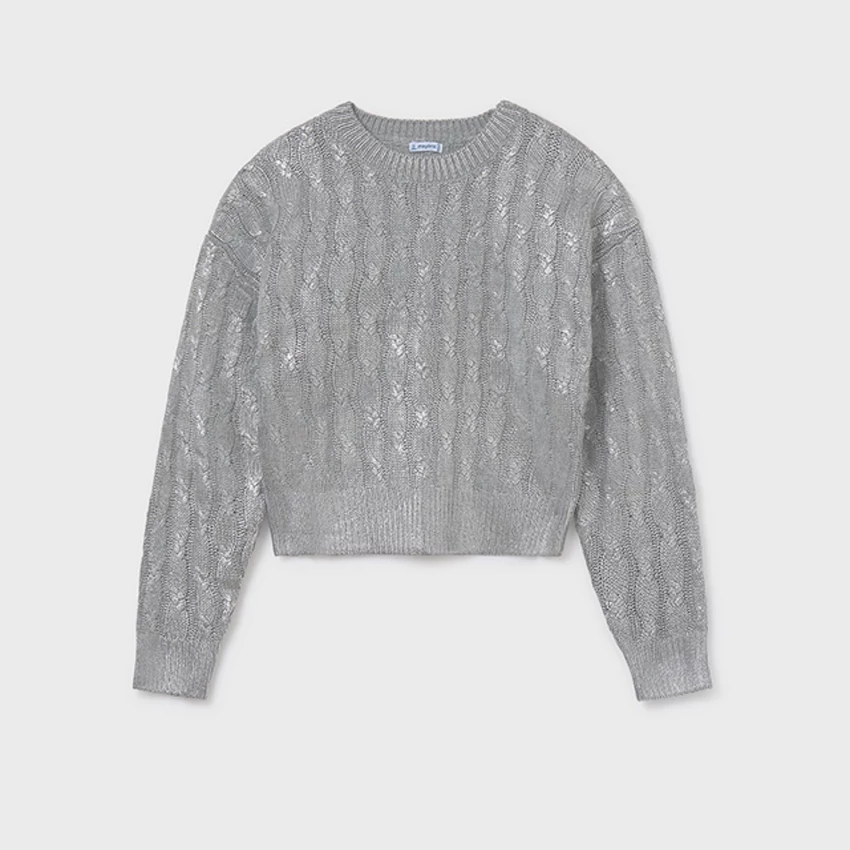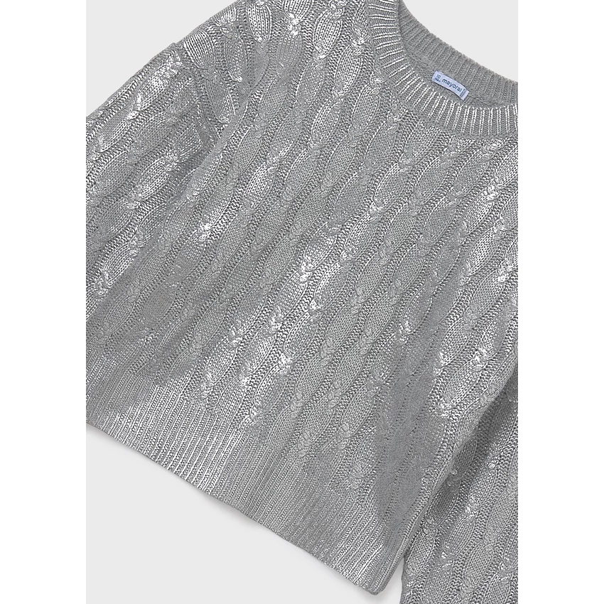 Mayoral gyönyörű fémesen csillogó ezüst kötött pulóver nagyon szép mintás kötéssel díszített, enyhén oversize laza fazonú, extra rugalmas és puha akril anyagú. Nagyon szép termék élőben is. | |