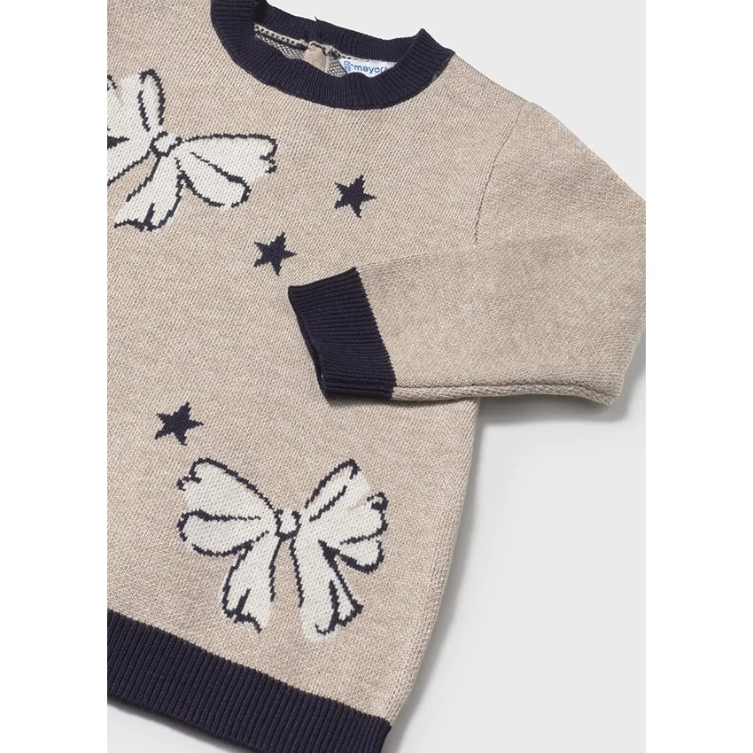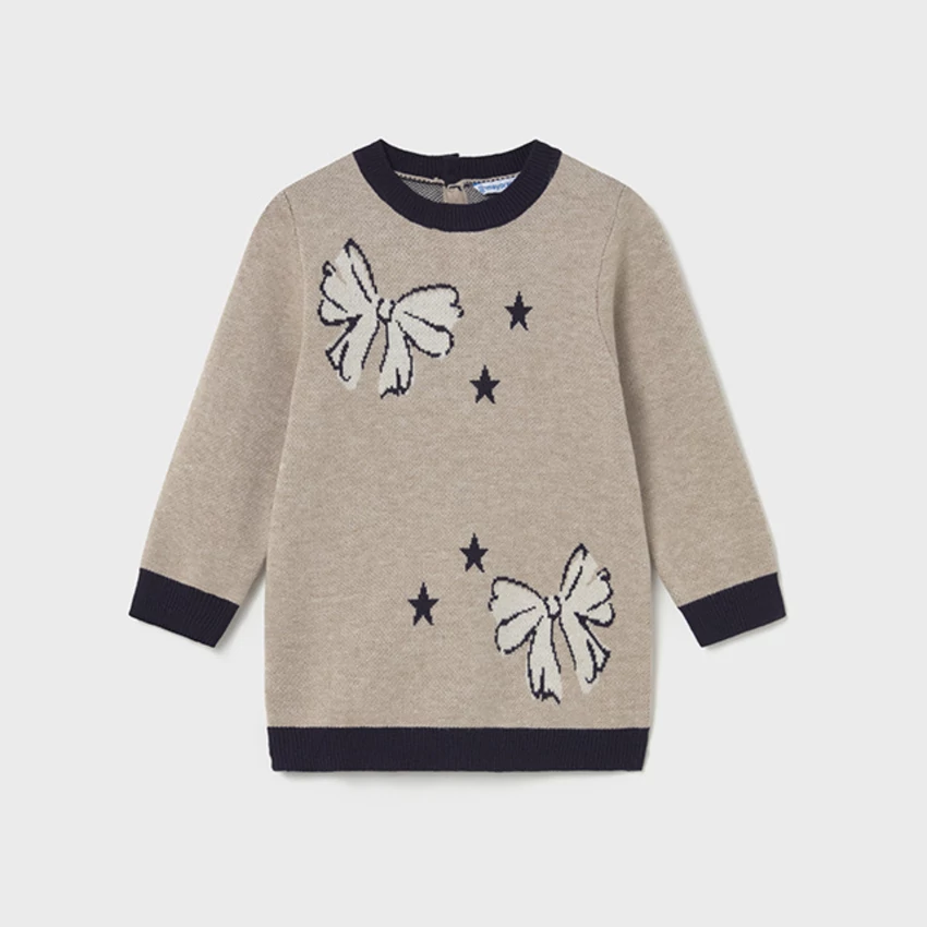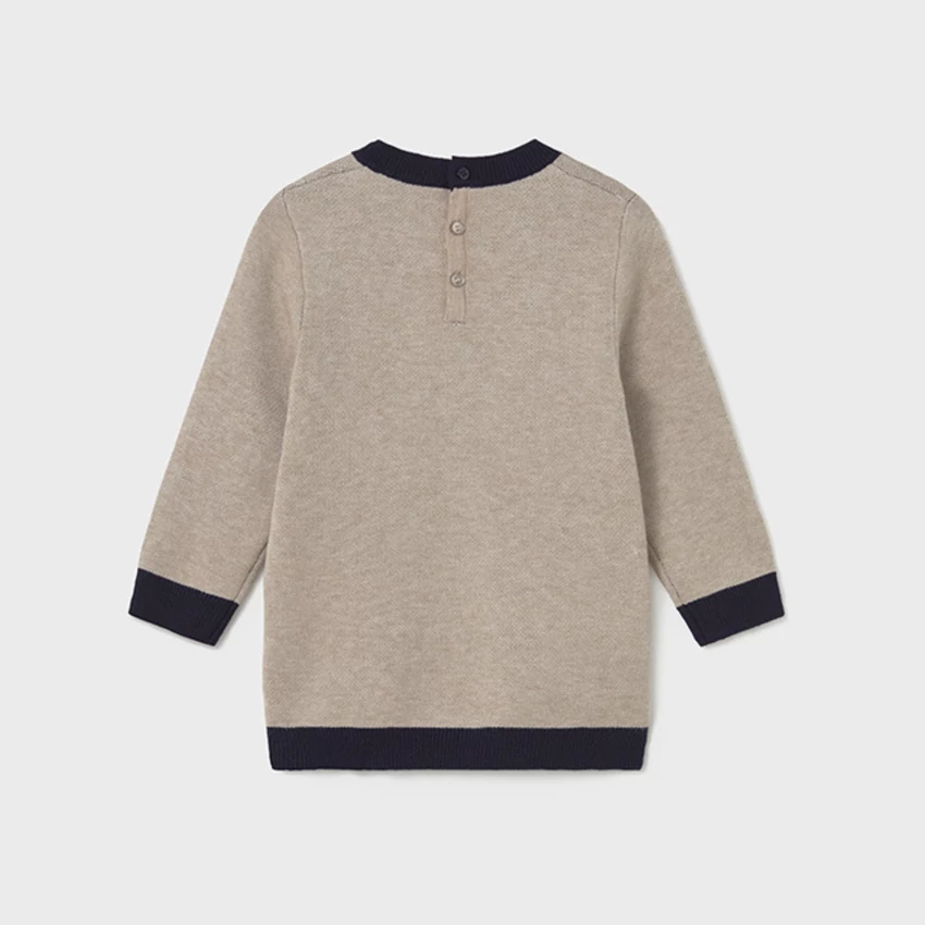 Mayoral cuki elöl masnimintás finomkötött pulcsiruha sötétkék passzéval az ujjain és az alján, puha, rugalmas és nagyon finom anyagú, egyedi és kényelmes őszi viselet. |