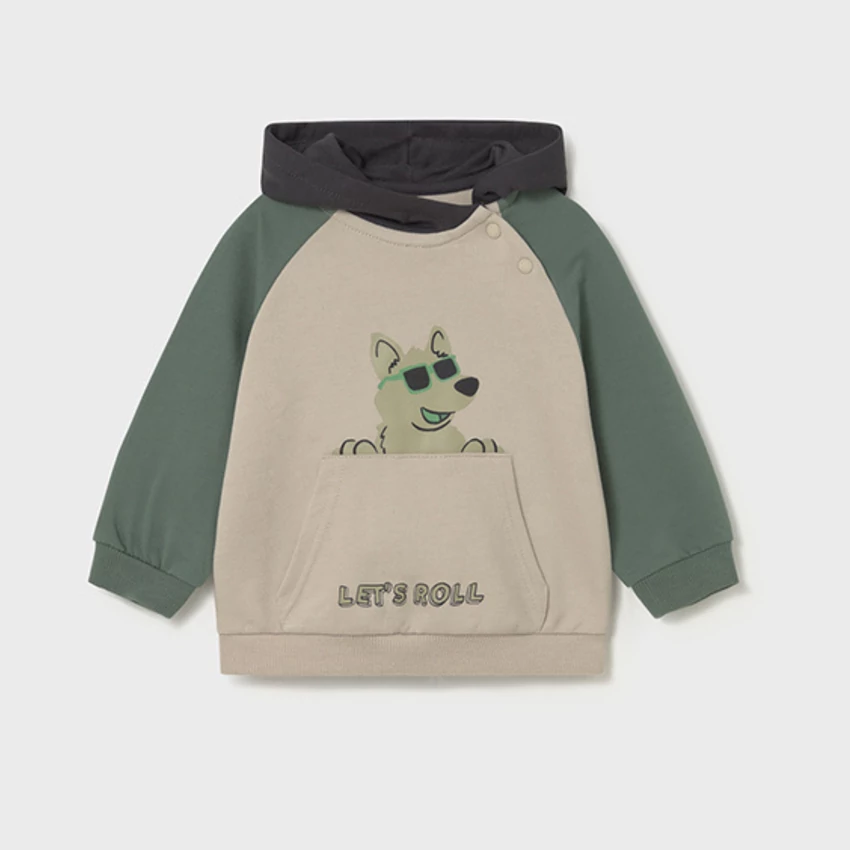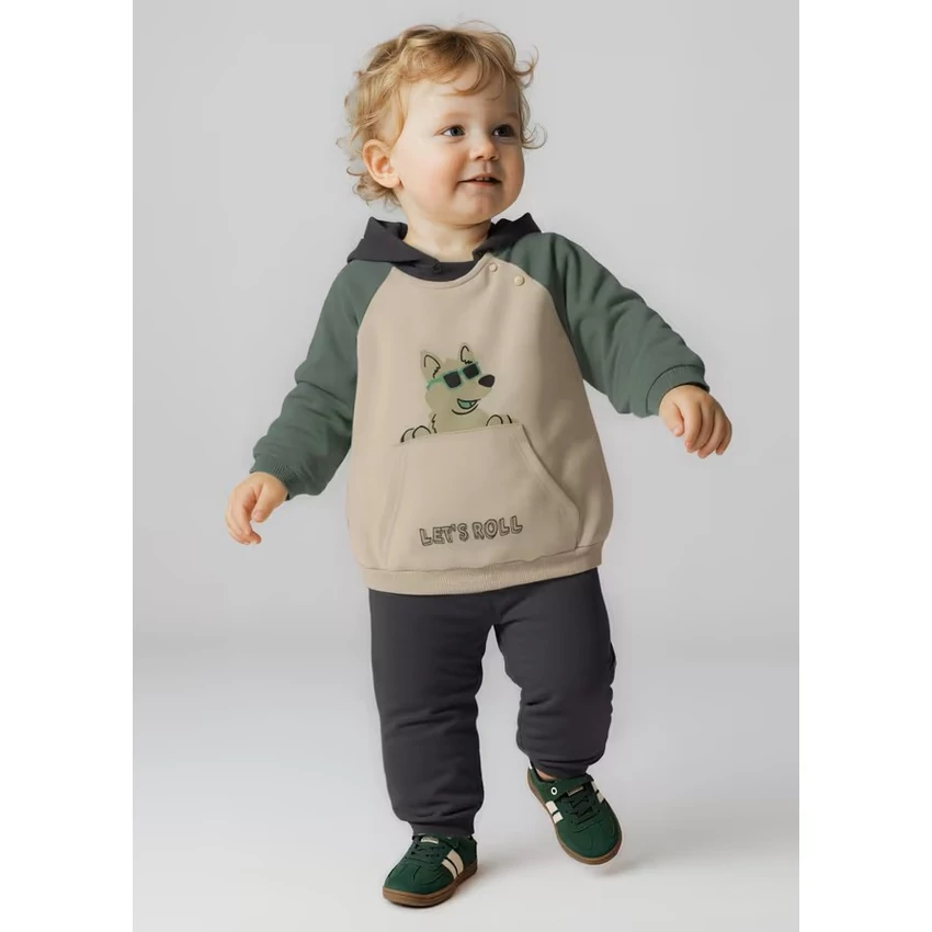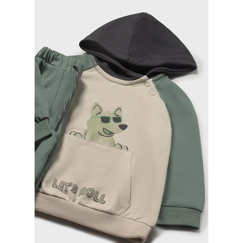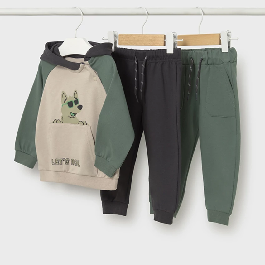 Mayoral 3 részes melegítő szett, ami egy kapucnis elöl pent elöl állatkás pamut melegítő felsőből, bolyhos béléssel, kenguruzsebbel, és 2 gumis derekú megkötős vastagabb melegítő alsóból áll, gumírozott derékrésszel, megkötővel, belül bolyhos béléssel. Praktikus őszi-téli viselet puha és rugalmas pamutból. | |