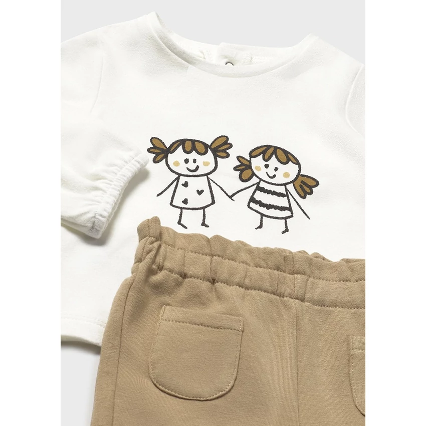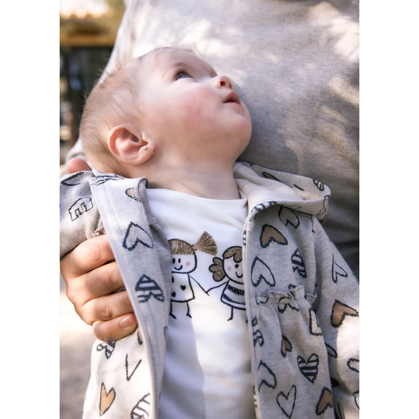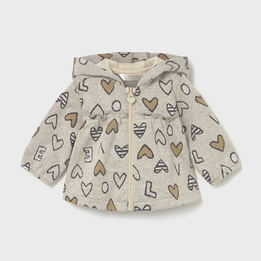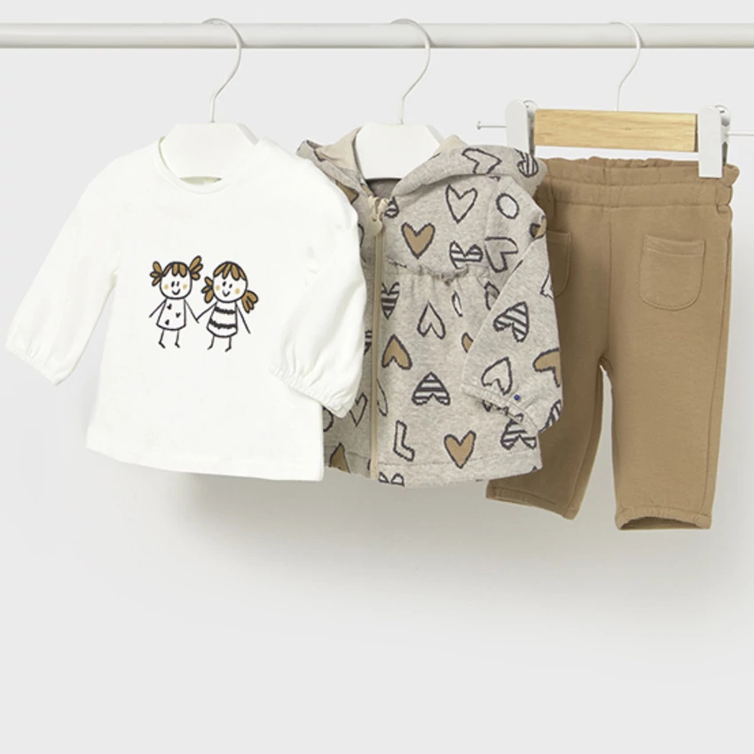 Mayoral 3 részes szett, ami egy elöl kislánymintás hosszú ujjú pamut felsőből áll, rugalmas pamut anyagból készült, hátán patentokkal nyitható, egy vastag rugalmas pamut anyagú cipzáras pulóverből áll, szívecskékkel díszített, A-vonalú fazonnal, pamuttal bélelt kapucnival, illetve egy gumírozott derekú szintén rugalmas pamut nadrágból áll, elöl 2 kis zsebbel. Nagyon szép szett a legkisebbeknek. | |