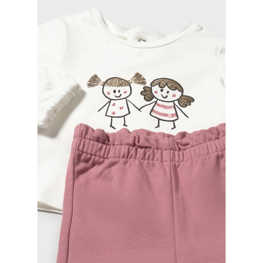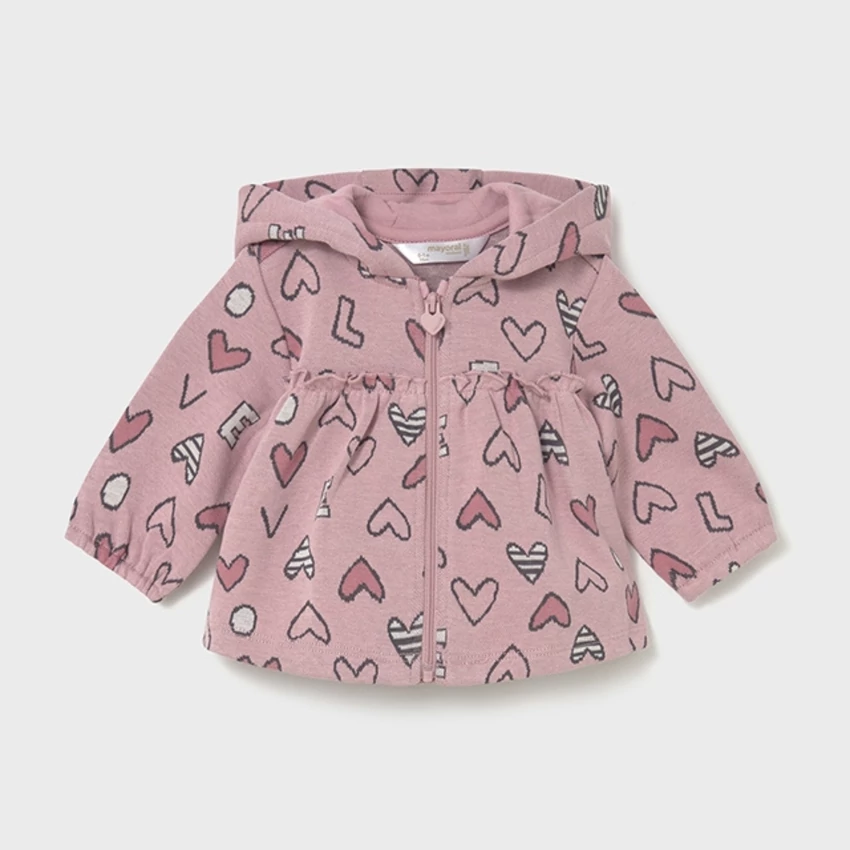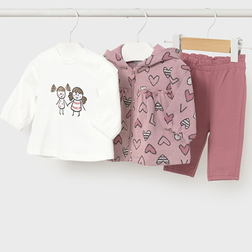 Mayoral 3 részes szett, ami egy elöl kislánymintás hosszú ujjú pamut felsőből áll, rugalmas pamut anyagból készült, hátán patentokkal nyitható, egy vastag rugalmas pamut anyagú cipzáras pulóverből áll, szívecskékkel díszített, A-vonalú fazonnal, pamuttal bélelt kapucnival, illetve egy gumírozott derekú szintén rugalmas pamut nadrágból áll, elöl 2 kis zsebbel. Nagyon szép szett a legkisebbeknek. | |