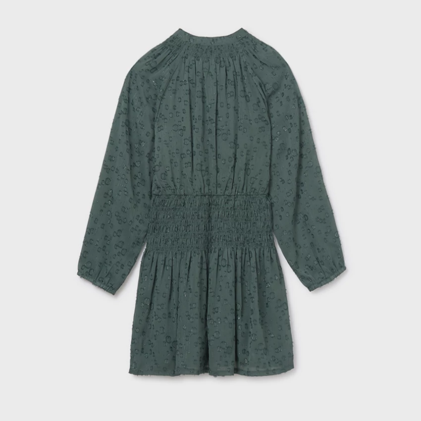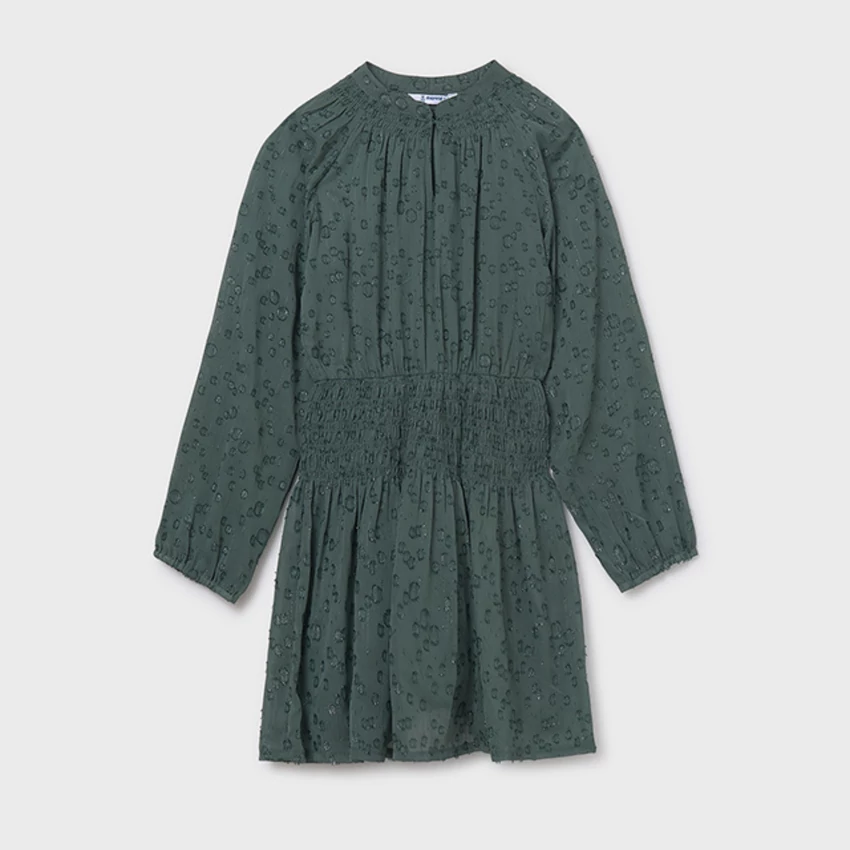 Mayoral gyönyörű anyagában aprómintásfinoman csillogó sifonruha széles gumírozott derékrésszel és ujjakkal, vékony alsóruhával ,elöl kerek álló nyakrésszel, ahol 1 gombbal zárható a ruha. Igazán egyedi és csinos nagylány viselet. | |