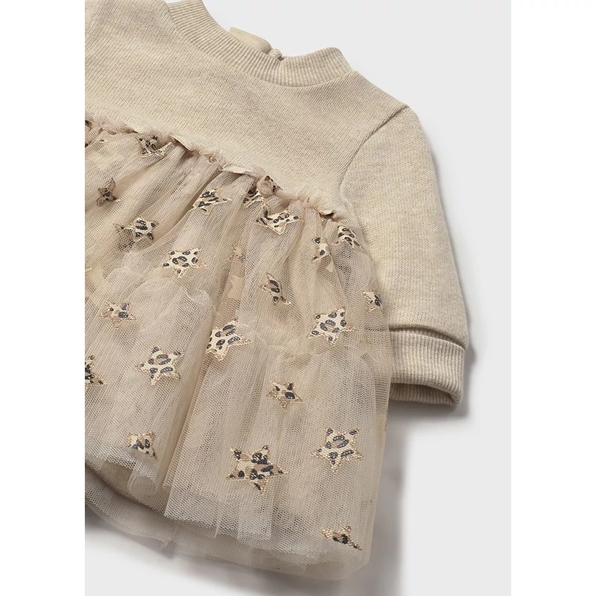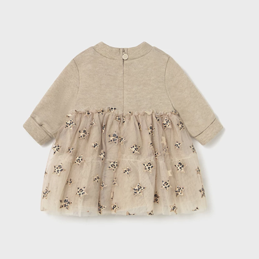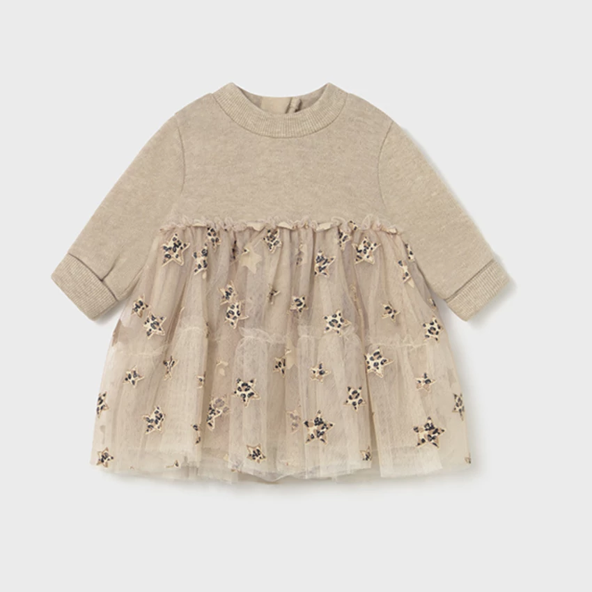 Mayoral meleg extra rugalmas ruha,a szoknya rész külső rétege puha tüllből készült, csillámos csillag mintával díszített, a ruha anyaga meleg bordázott finomkötött anyagú, rugalmas, belül puha bolyhozott béléssel, ujjain visszahajtható passzés végződéssel, hátán rejtett cipzárral. Gyönyörű ,egyedi és kényelmes ruha a legkisebbeknek. | |