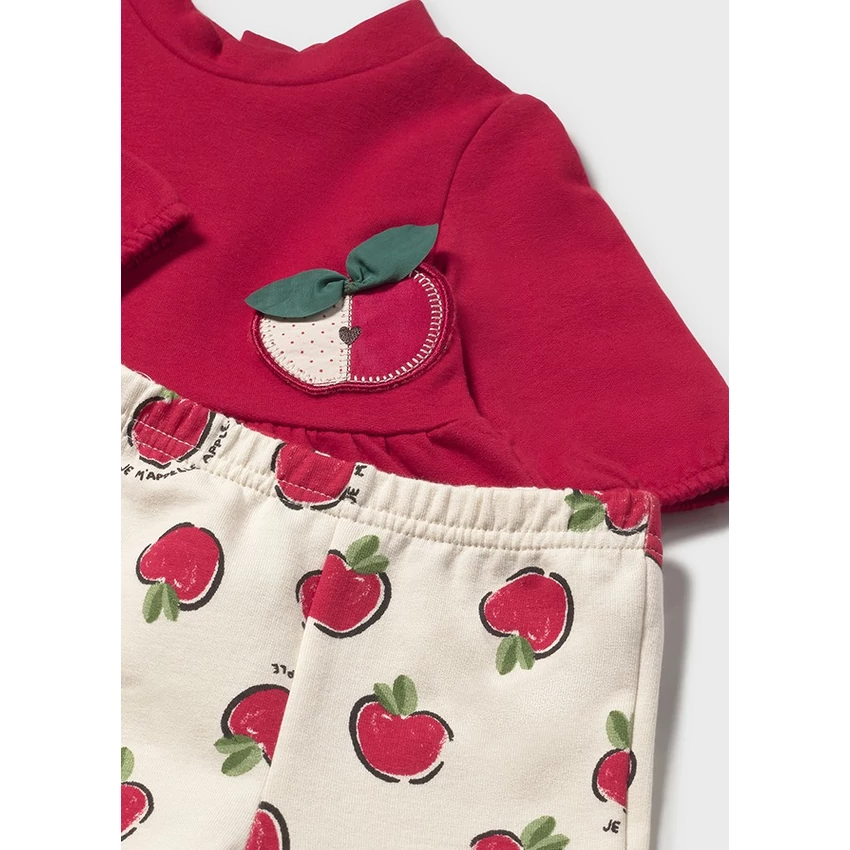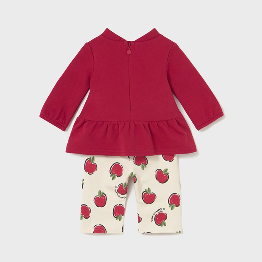 | Mayoral extra rugalmas 2 részes szett, ami egy A-vonalú piros, finoman bolyhos vastagabb felsőből, rávarrt almamintás mini zsebből és fodros alsó szegélyből, valamint egy krémszínű alapon, piros almamintás, belül bolyhos rugalmas derekú nadrágból áll, egyenes szabással. Csodaszép extra vidám szett. | |
