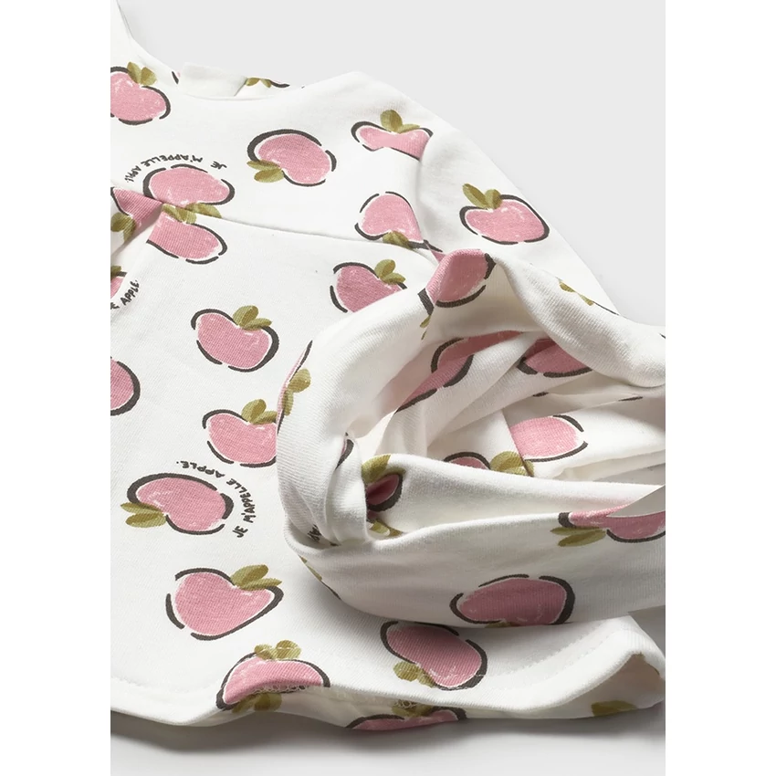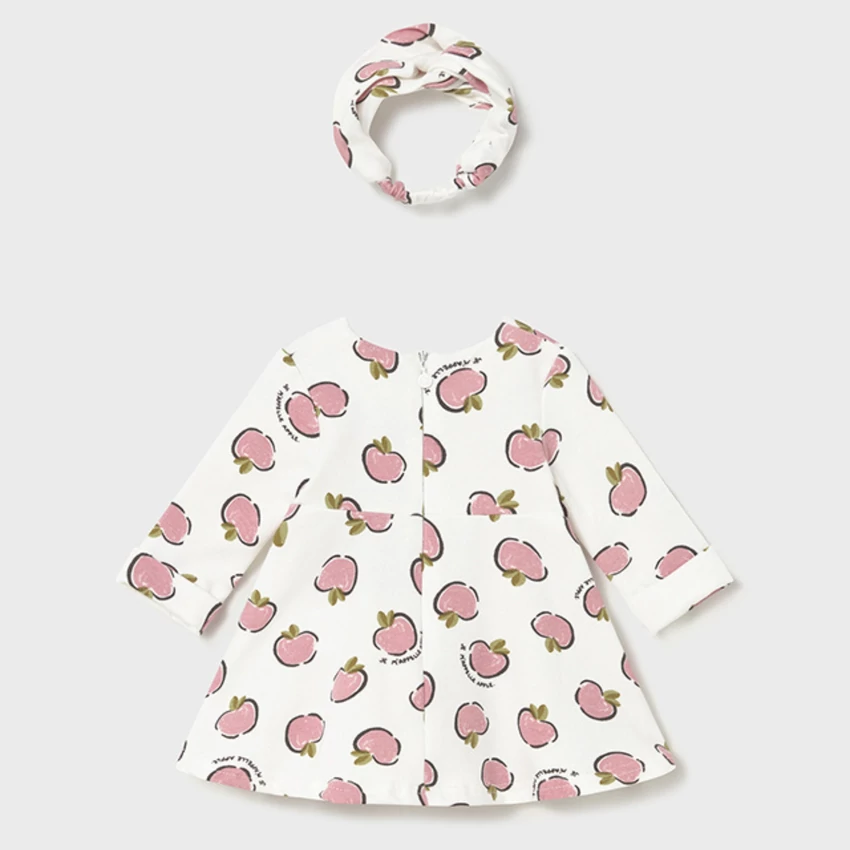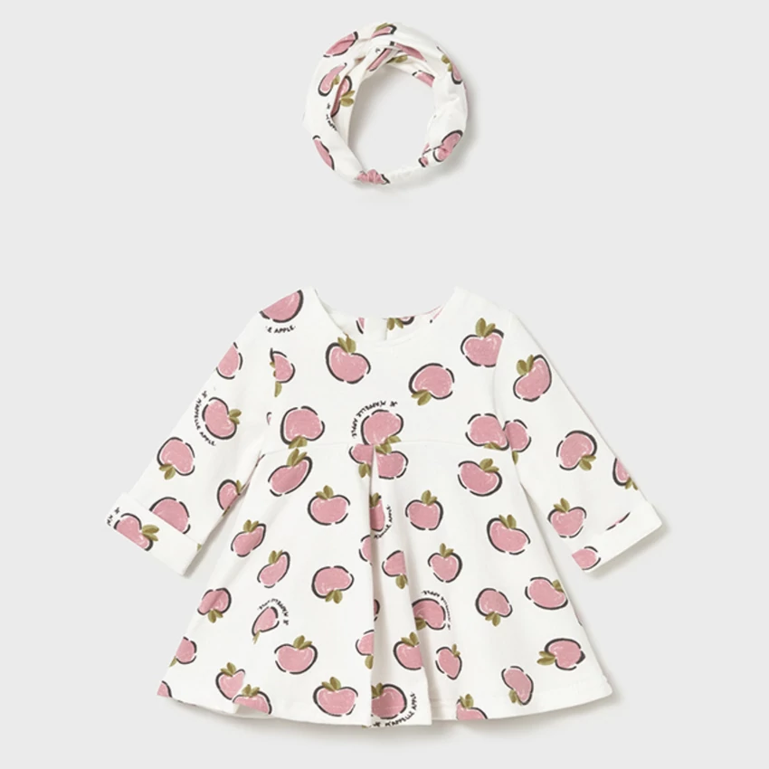 Mayoral extra rugalmas 2 részes szett, ami egy A-vonalú, fehér alapon rózsaszín almamintás, belül finoman bolyhos, mellrésznél redőzött, hátulján rejtett cipzáras vastagabb anyagú pamutruhából és egy rugalmas, a ruha mintájával megegyező mintájú fejpántból áll. Csodaszép extra rugalmas téli ruha. |