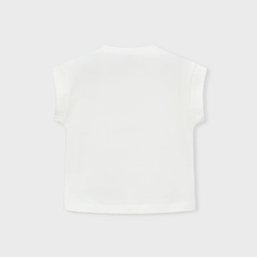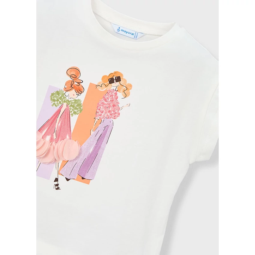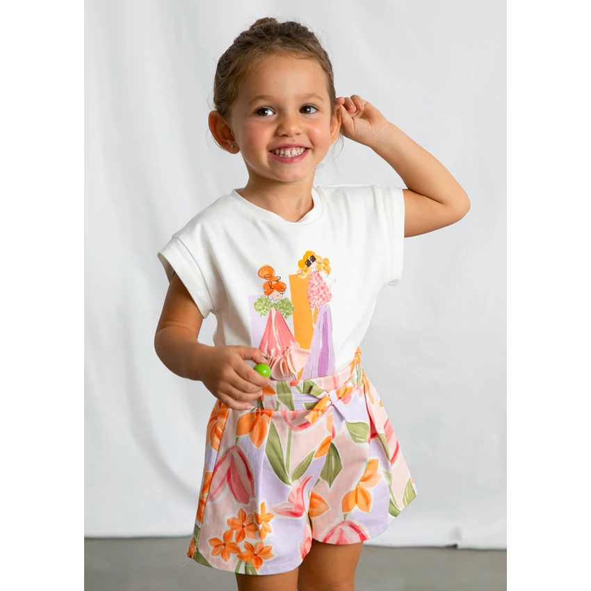 | Mayoral elöl topmodellekkel díszített ejtett vállú csinos felső, az egyik modell szoknyája 3D szirmokkal díszített, lazább szabású, visszahajtott ujjakkal, extra rugalmas puha pamut anyagból készült. A mintával egyező rövidnadrág külön kapható hozzá. | |
