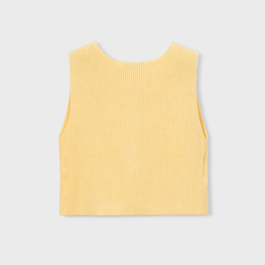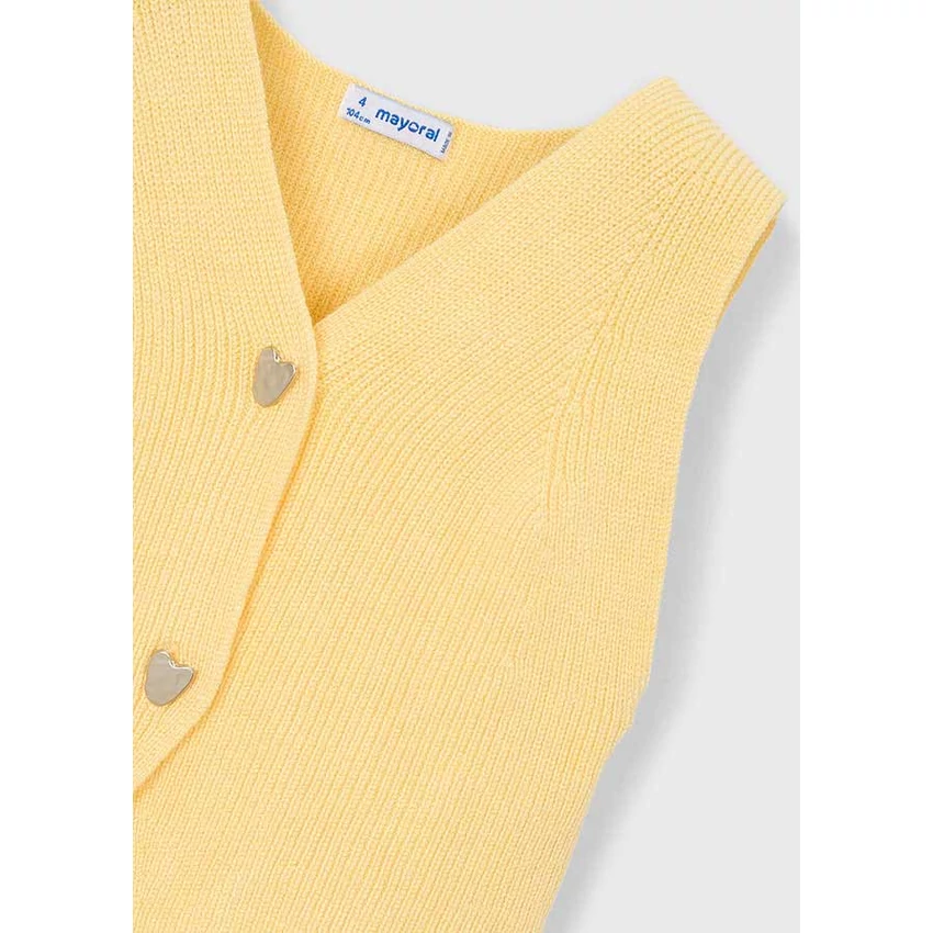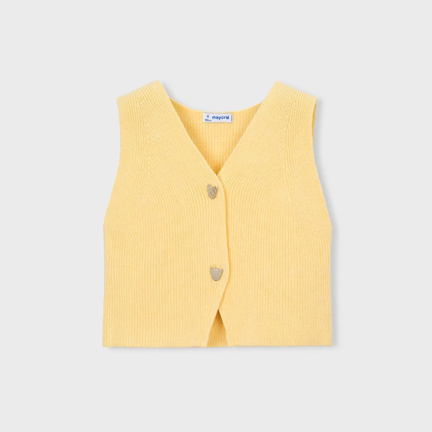 | Mayoral extra csinos különleges szívformájú gombokkal díszített bordázott kötött mellény, ami felsőként használható, rugalmas és finom tapintású kötött viszkóz anyagból készült, rövid csinos fazonú a nyár egyik kedvenc vanília színében. 2026 NYÁR | |