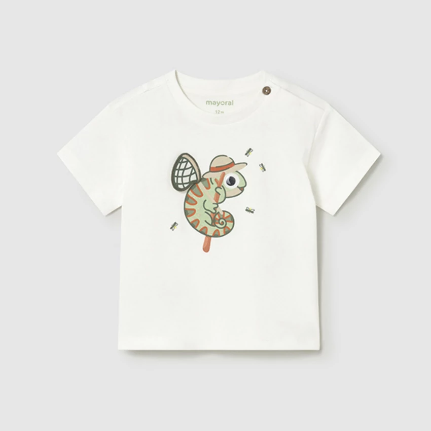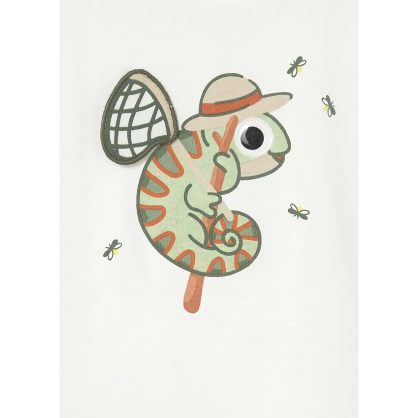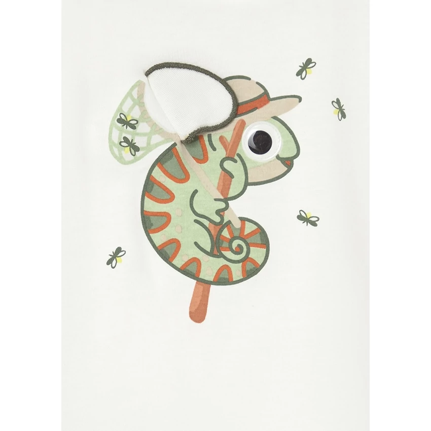 Mayoral kaméleon mintás rövid ujjú felső cuki kihajtható füllel, puha pamutból készült, vállán patentokkal nyitható. 2026 NYÁR