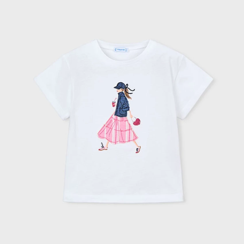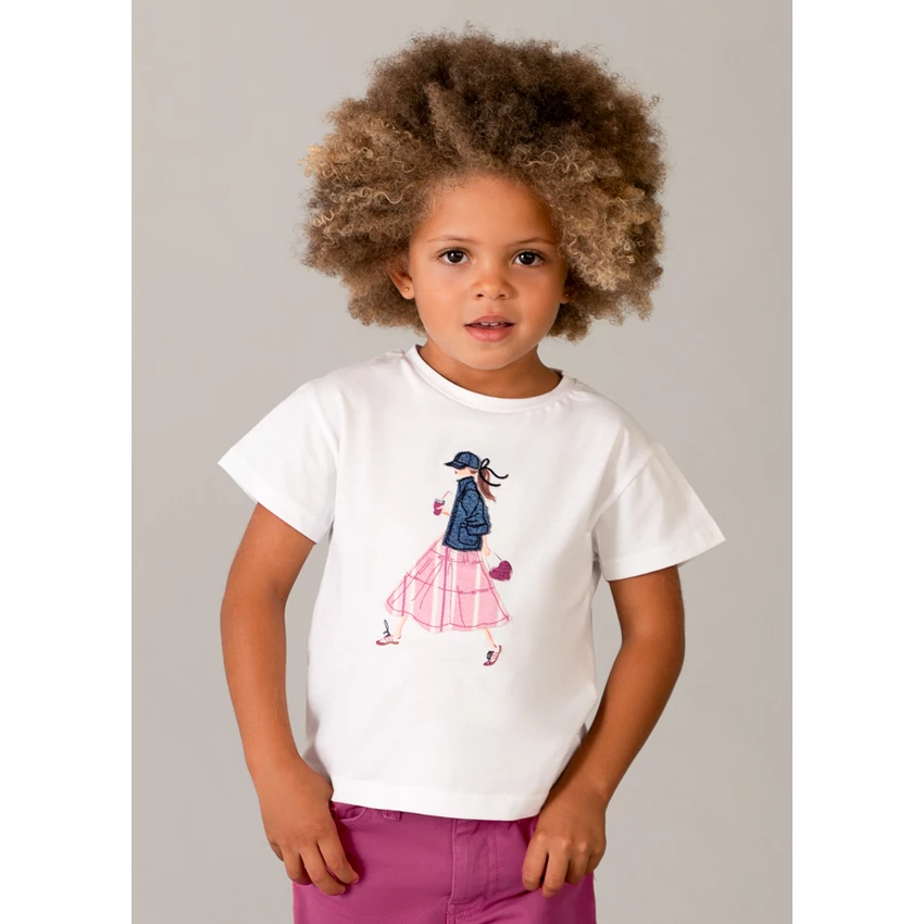 | Mayoral csinos lánnyal díszített rövid ujjú nyári felső letisztult póló szabású, puha pamut anyagból készült, rávarrt egyedi mintával. | |