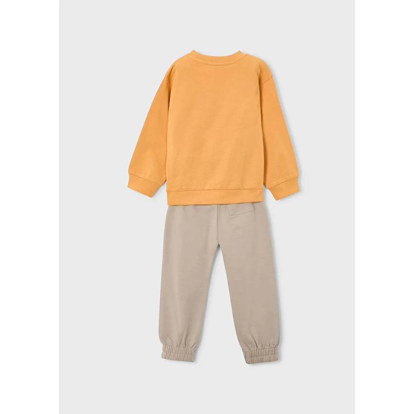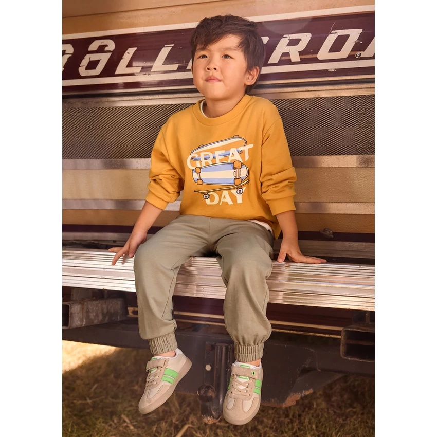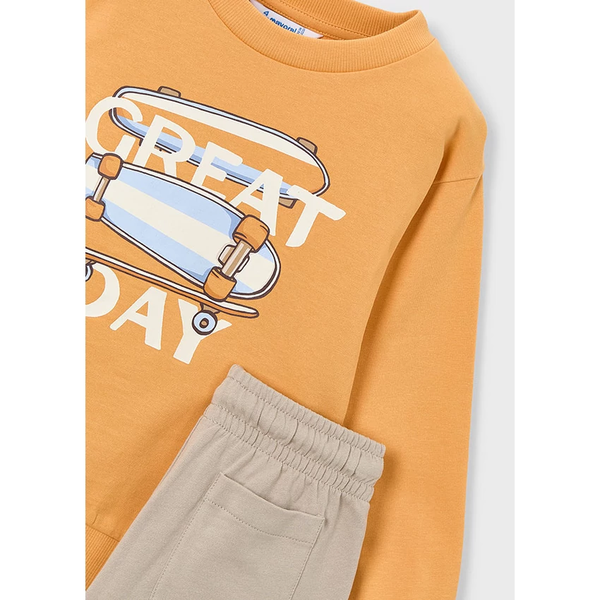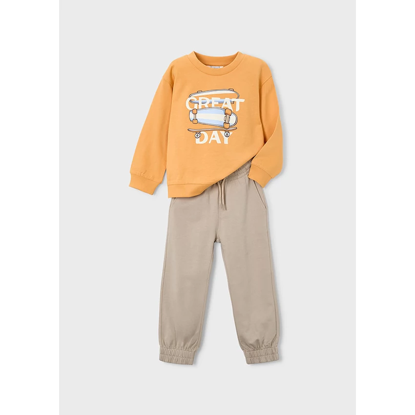 | Mayoral kétrészes tavaszi melegítő szett, ami egy elöl gördeszkás-feliratos kerek nyakú pamut pulóverből áll, illetve egy gumis derekú megkötős melegítőnadrágból áll, elöl zsebekkel, hátul egy farzsebbel, pamut passzéval alul. Vékony pamut anyagból készült kényelmes tavaszi-nyári szett. 2026 NYÁR | |