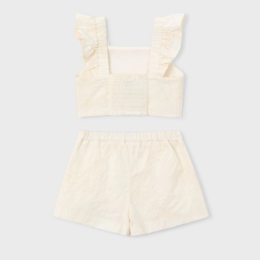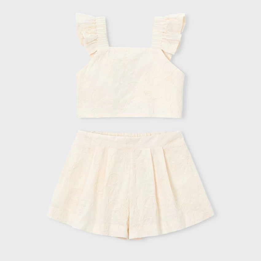| Mayoral álomszép hímzett virágmintás alkalmi nyári szett, ami egy rövid fazonú fodros pántokkal díszített topból áll, hátán gumírozott, pamut anyagú, fehér hímzett virágok teszik különlegessé, a rövidnadrágja szintén hímzett, A-vonalú elöl enyhén redőzött, hátul teljesen gumírozott a dereka, vékony pamut béléssel rendelkezik a top és a nadrág is. Igazán különleges nyári szett alkalmakra. 2026 NYÁR | |