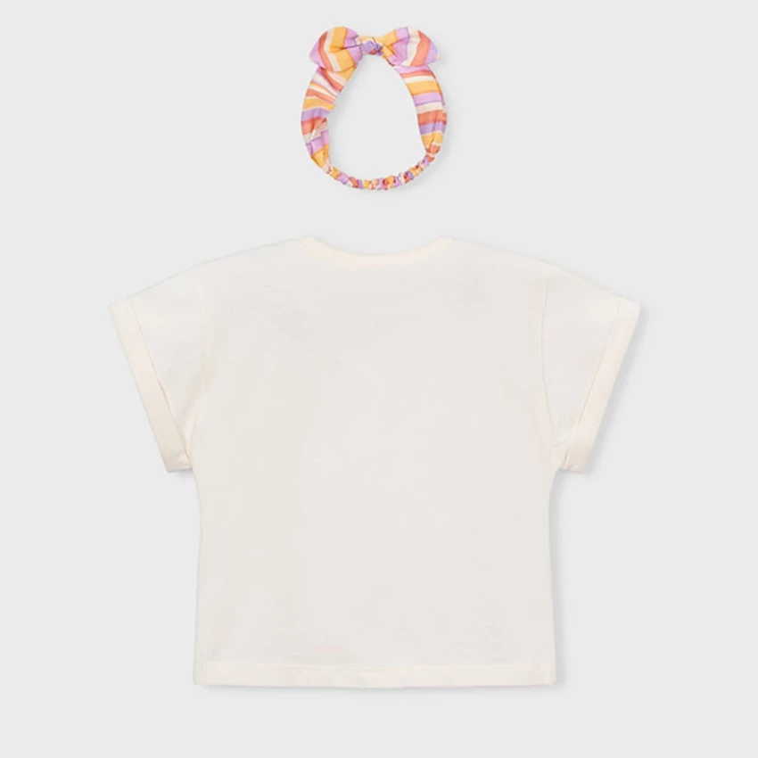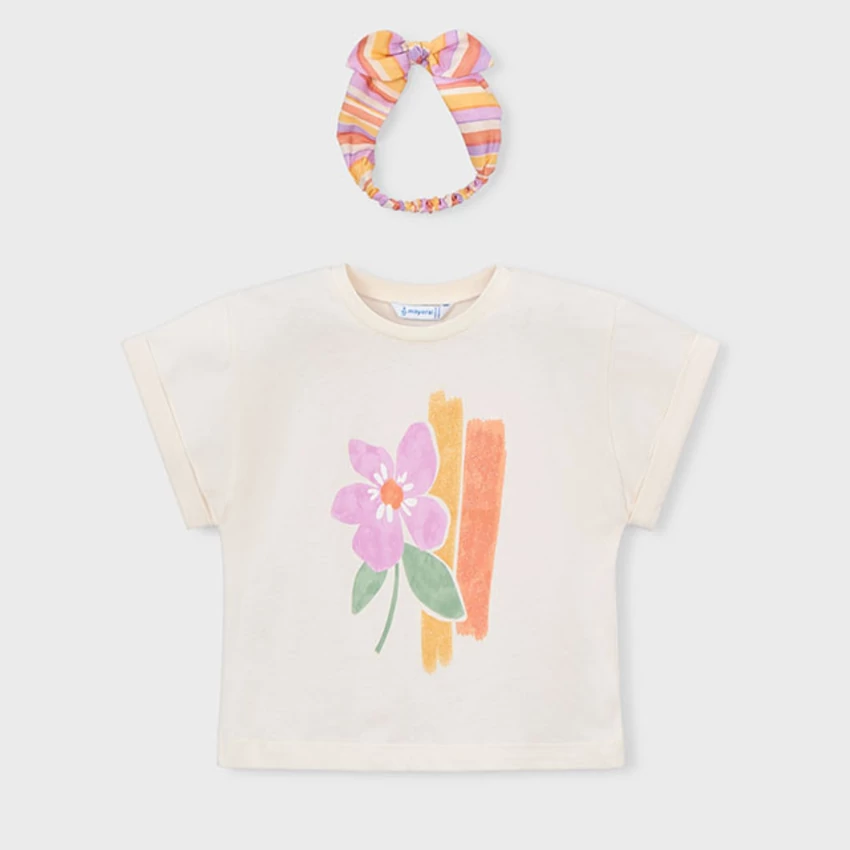 | Mayoral csinos virágmintás felső szép színkombinációban, gumírozott csíkos fejpánttal, visszahajtott ujjakkal, puha pamutból készült egyedi termék..2026 NYÁR | |