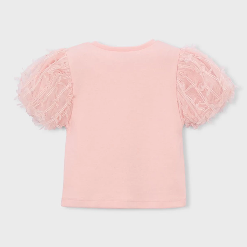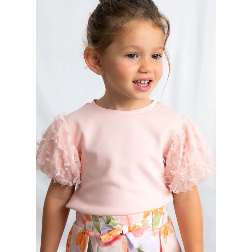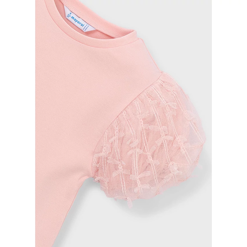 | Mayoral csodaszép ujjain tüll masnikkal díszített puffos ujjú felső gumírozott ujjakkal, pihe-puha rugalmas pamut anyagú , ugyanilyen mintájú és színű szoknya külön kapható hozzá. 2026 NYÁR | |