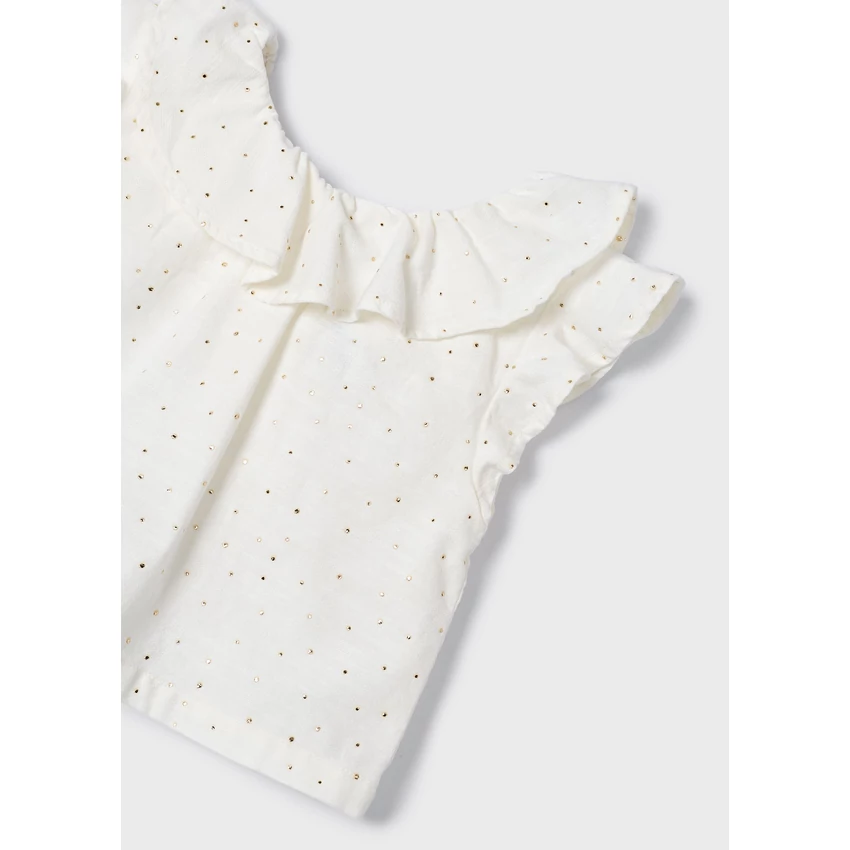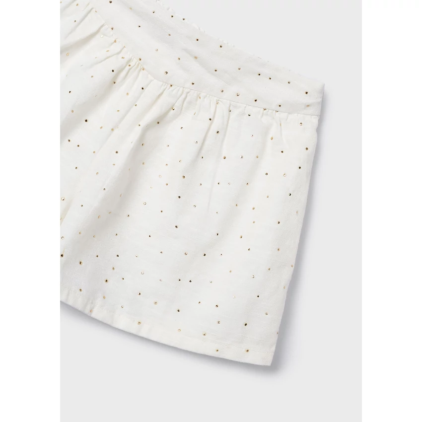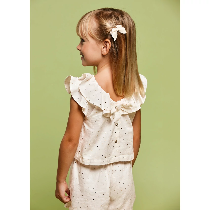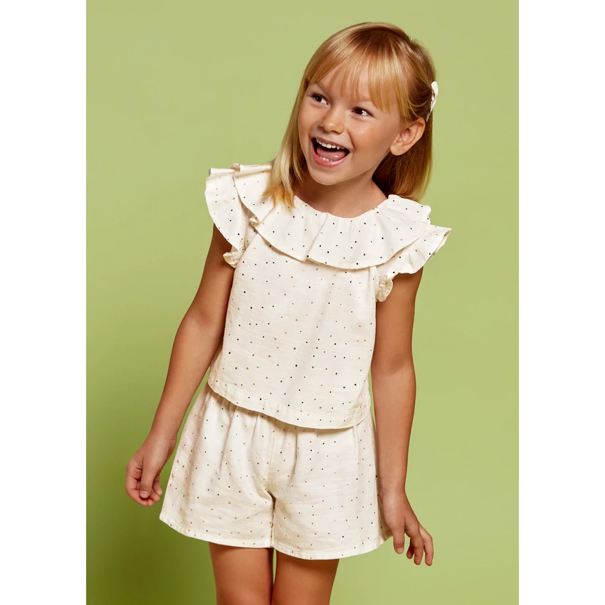 | Mayoral csodaszép arany pöttyös nyári blúz és rövidnadrág szett, a felső elöl fodros hátán végig gombokkal záródik és es masni díszíti, a nadrág enyhén A-vonalú hátul teljesen gumírozott, ugyanígy végig apró csillogó arany pöttyökkel díszített. Nagyon letisztult csodaszép egyedi termék, puha és finom 100% pamutvászonból készült . | |