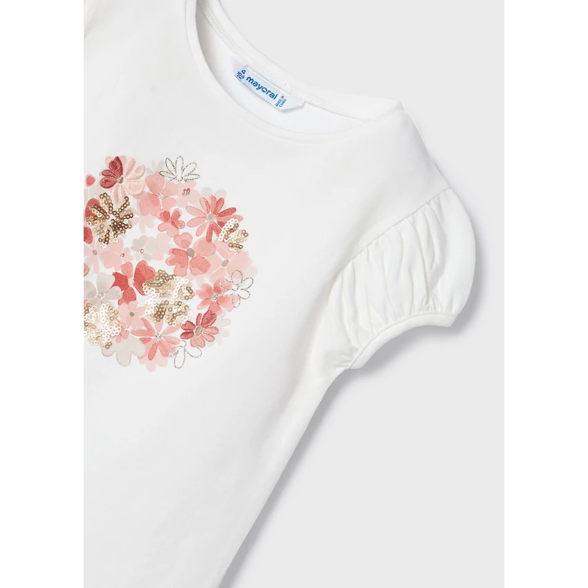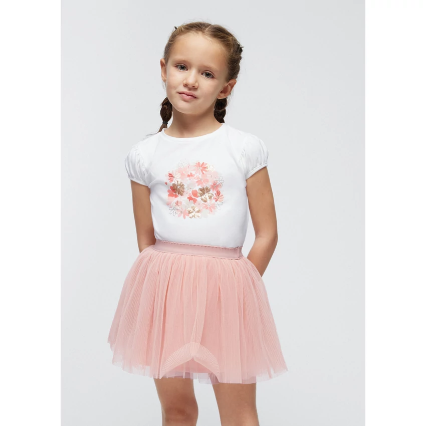 | Mayoral virágmintás felső és tüllszoknya szett, ami egy extra puha és rugalmas virágmintás rövid ujjú felsőből, és egy minta nélküli gumírozott derekú tüllszoknyából áll, pamut alsószoknyával. Csinos nyári viselet. | |
