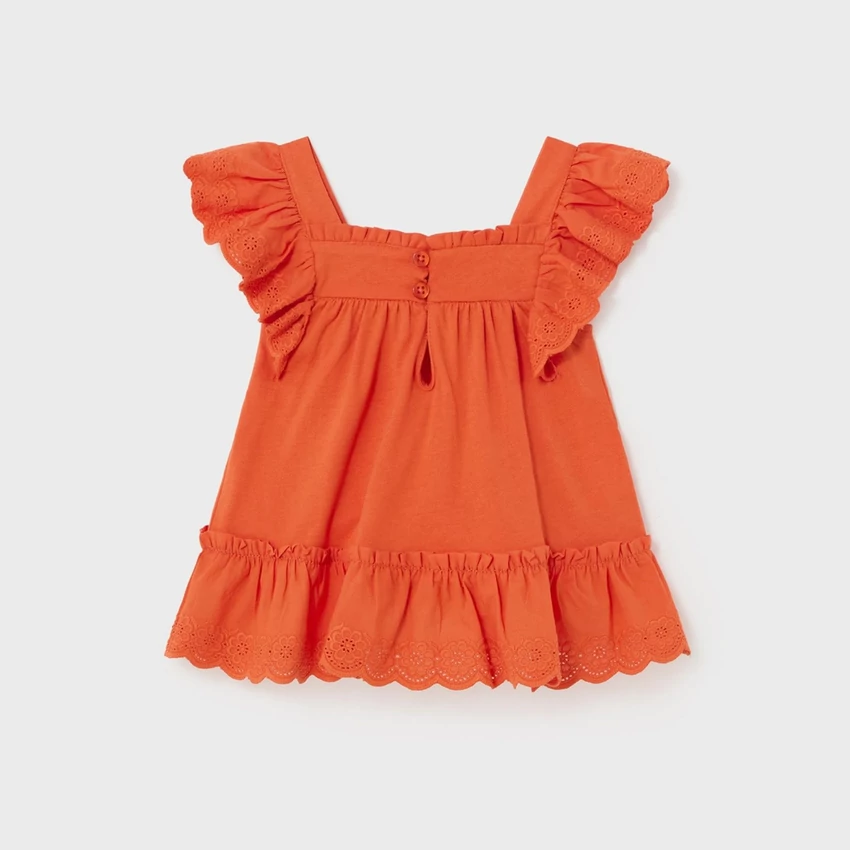 Mayoral gyönyörű csipkés A-vonalú blúz fodros ujjakkal, gumírozott mellrésszel, apró rojtokkal díszített, hátán 2 gombbal nyitható, alul is csipkemintás fodorral díszített. Puha pamutból készült letisztult fazonú csinos blúz. | |