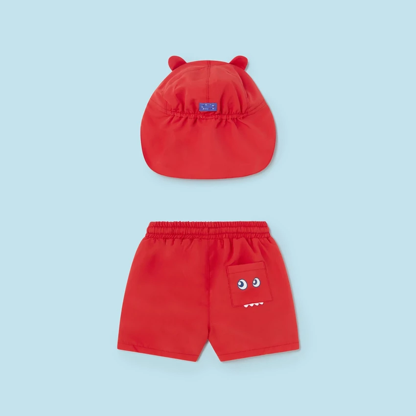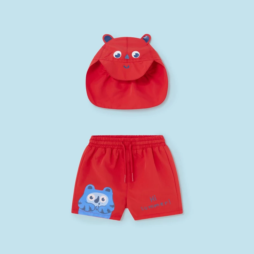Mayoral kétrészes fürdőkalap és fürdőnadrág szett, ami egy nyakat is takaró hosszított fürdőkalapból, és egy derékban megköthető fürdőnadrágból áll. Mindkét termék cuki állatka mintás. | |