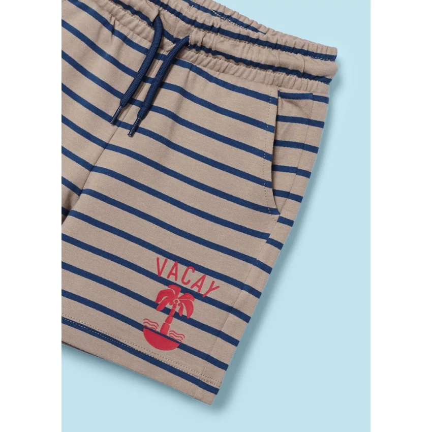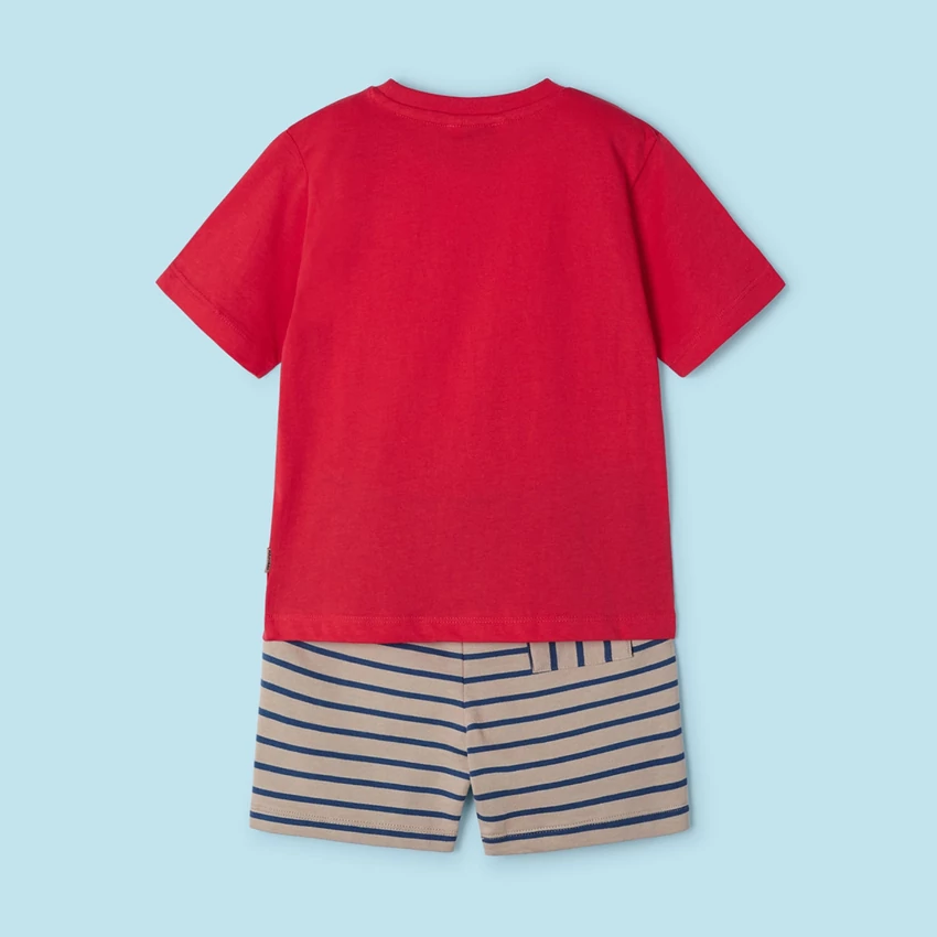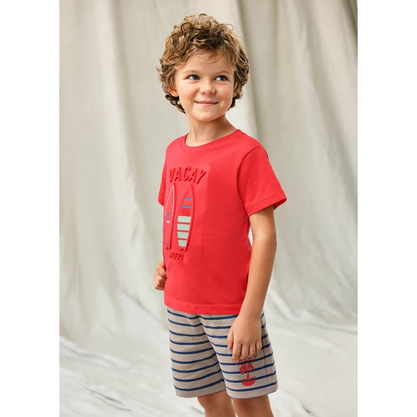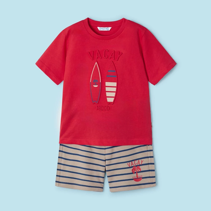 | Mayoral kétrészes felső és rövidnadrág szett, ami egy dombornyomott szörfmintás rövid ujjú nyári felsőből áll, és egy derékban megköthető puha pamutból készült csíkos rövidnadrágból áll. | |