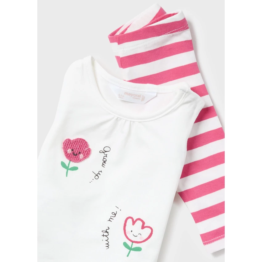 Mayoral 4 darabos virágmintás felső és nadrág szett, ami 2 hosszú ujjú A-vonalú felsőből, és 2 gumírozott derekú nadrágból áll, az egyik virágos a másik csíkos. Nagyon elasztikus puha pamutból készült. | |