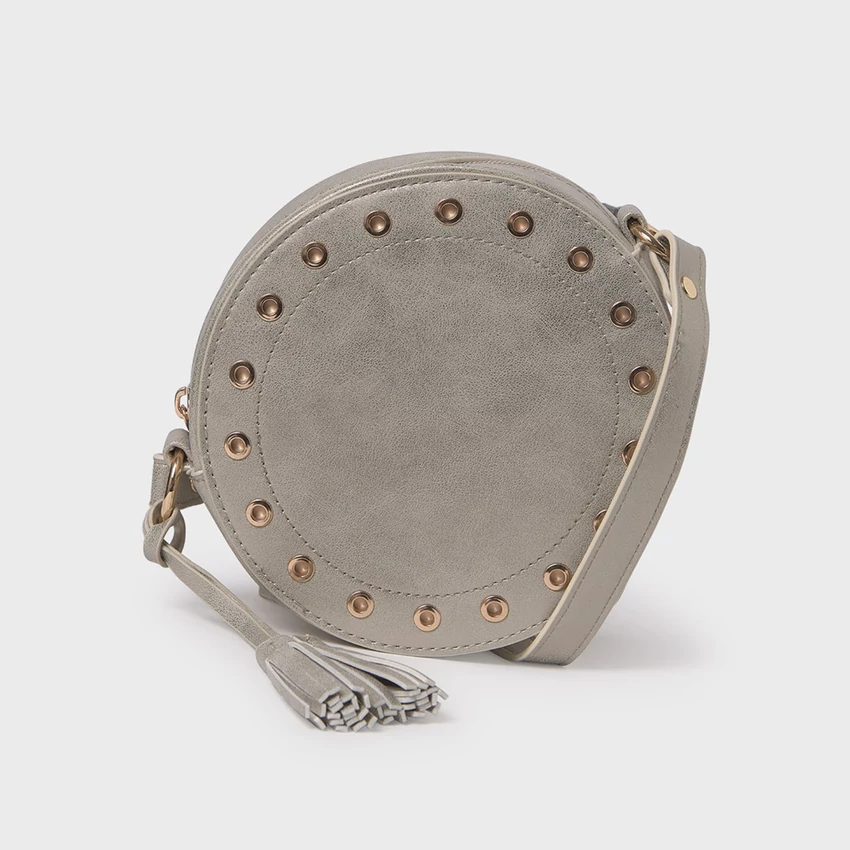 | Mayoral szegecsekkel és rojtokkal díszített díszített kerek válltáska állítható vállpántokkal, a táska cipzárral záfródik. Átmérője a táskának: 17 cm. | |