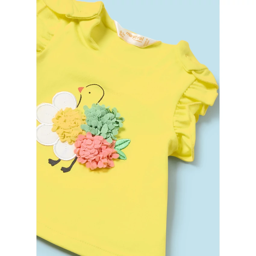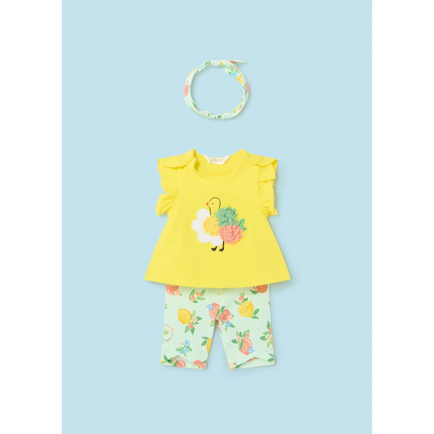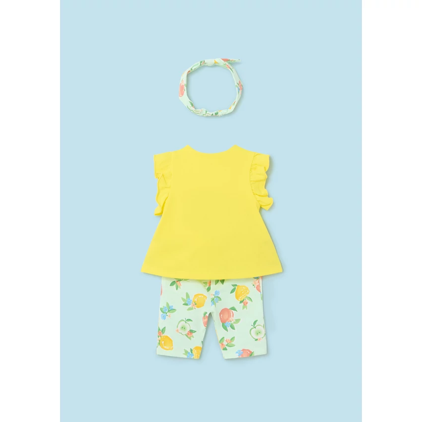 Mayoral 3 részes nyári szett, ami egy 3D tüllel díszített állatkás fodros ujjú felsőből A-vonalú fazonnal, egy gyümölcsmintás gumírozott derekú caprinadrágból, és masnis gumírozott gyümölcsmintás fejpántból áll. Nagyon pihe-puha és rugalmas pamut anyagból készültek. | |